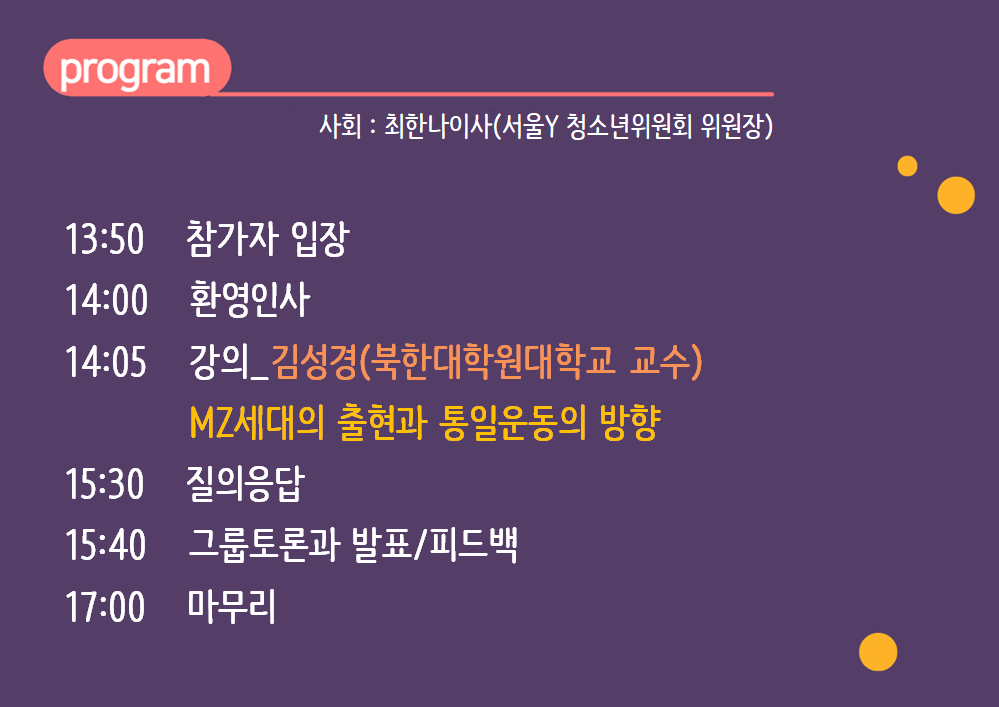MZ 세대의 출현과 통일운동의 방향에 대해 2차 평화포럼이 ‘MZ세대의 출현과 통일운동의 방향’ 이란 제목으로 북한대학원대학교의 김성경교수님의 발제 후 그룹별 토론이 이어집니다.