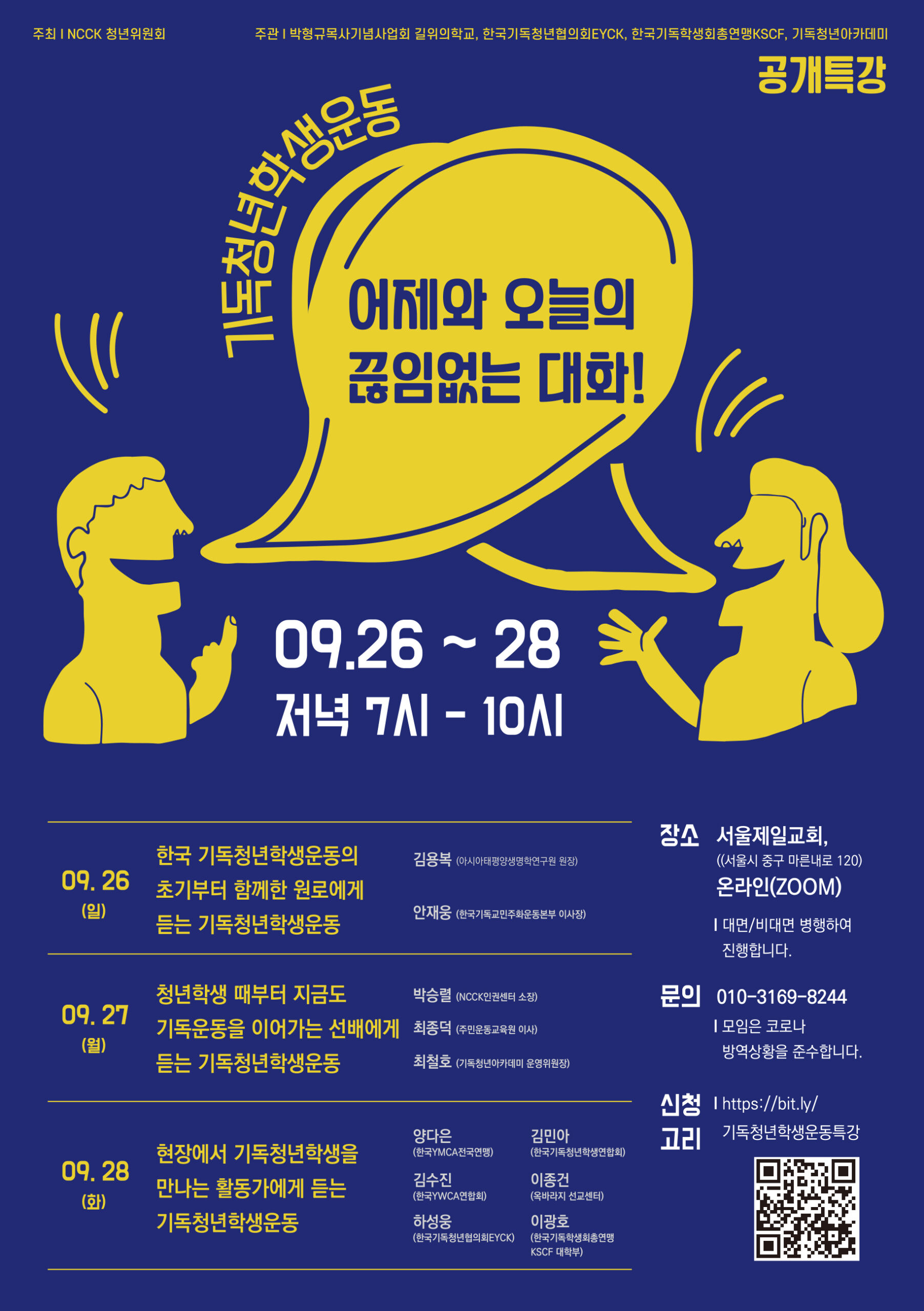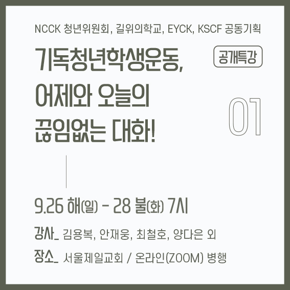 교회와 기독교 기관이 코로나19 확산의 주요한 지점이 되고, 계속해서 청년들이 교회를 이탈하는 현 상황을 극복하기 위해 한국기독교교회협의회(이하 NCCK) 청년위원회는 ‘어제와 오늘의 끊임없는 대화’라는 주제로 공개특강을 개최했다. 이번 공개특강은 기독청년학생운동의 원로, 선배, 그리고 현직 활동가의 이야기 3개 파트로 나눠 진행됐다. <한국 기독청년학생운동의 초기부터 함께한 원로에게 듣는 기독청년학생운동>은 김용복, 안재웅 원로가 진행했고, <청년학생때부터 지금도 기독운동을 이어가는 선배에게 듣는 기독청년학생운동>은 박승렬, 최종덕, 최철호 선배가 80-90년대 기독청년학생운동을 시작으로 지금까지의 삶을 이야기했다. 공개특강의 마지막날은 <현장에서 기독청년학생을 만나는 활동가에게 듣는 기독청년학생운동>이란 주제로 양다은, 김수진, 하성웅, 김민아, 김표정, 이광호 활동가가 자신이 속한 단체에 대한 소개와 함께 자신의 현장과 운동성에 대한 경험을 나눴다(강연자의 자세한 정보는 공개특강 포스터를 참고). 온오프라인으로 진행된 이번 특강은 3일동안 대면/비대면 약 150여명이 참여했다.