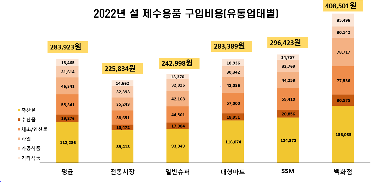 – 전통시장(225,834원) < 일반슈퍼마켓 < 대형마트 < SSM < 백화점 (408,501원) 순