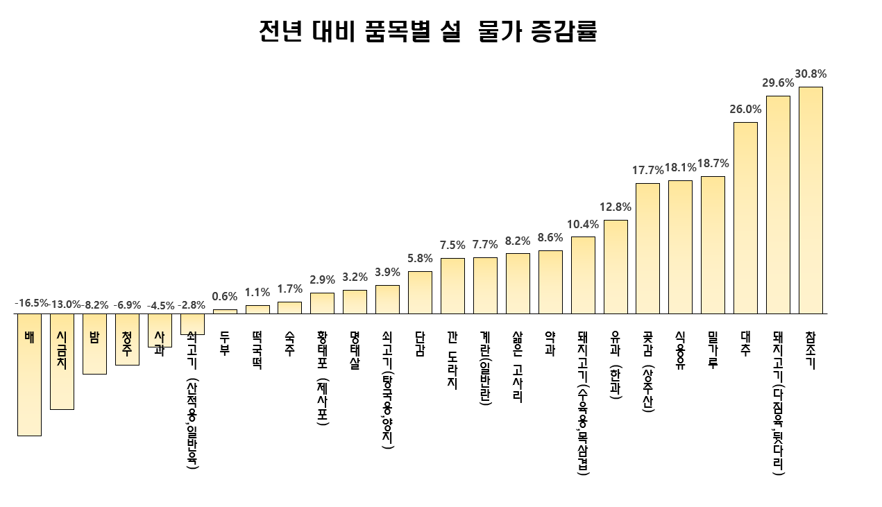 채소/임산물은 시금치(-13.0%), 밤(-8.2%) 등의 가격 하락에도 불구하고 대추(26.0%), 삶은 고사리(8.2%), 깐 도라지(7.5%) 등이 올라 평균 5.3% 상승했다. 특히 가공식품 중에서는 설 명절상 준비에 기본이 되는 품목인 밀가루와 식용유가 각각 18.7%, 18.1%로 크게 올라 소비자들이 느끼는 체감물가는 클 것으로 보인다. 한편 과일 품목은 2021년에 사과, 배 등의 재배면적 증가와 작황 양호에 따른 생산량 증가로 인해 1.1% 하락했다. 그 중에서 배(3개 기준)가 전년 14,909원에서 올해 12,443원으로 16.5% 하락, 사과(5개 기준)는 전년 12,519원에서 올해 11,953원으로 4.5% 하락했다.