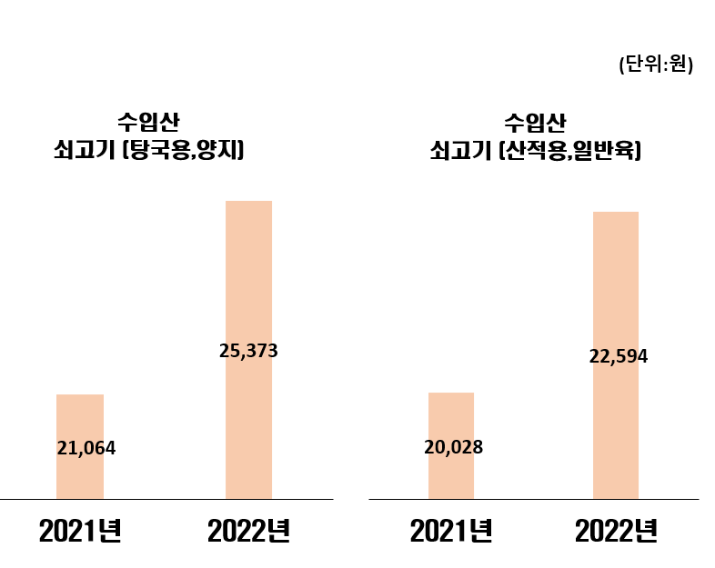 해외에서의 육류 수요 증가와 물류 대란의 여파로 지난 8월부터 가격이 상승하고 있는 수입산 쇠고기에 대한 가격 관리가 필요할 것이다. 또한 수입산 채소/임산물 역시 삶은 고사리 27.4%, 깐 도라지 9.7%, 숙주 6.4% 상승했는데, 국내산이 각각 8.2%, 7.5%, 1.7% 상승한 것과는 대비되게 큰 폭의 오름세를 보였다.