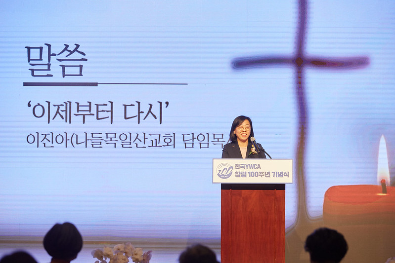 “이제부터 다시” 라는 주제로 나들목일산교회 이진아 목사님께서 전해주신 설교 말씀을 통해서는 과거를 돌아보고 새로운 100년을 바라보는 소망의 시간을 가지게 되었습니다. 가부장적 권위주의에 오염돼 청년 세대의 신뢰를 잃은 한국 기독교 안에서 예수의 본을 실천하는 한국YWCA의 역할에 대한 기대를 전하셨습니다.