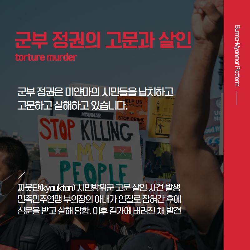 군부 정권은 계속해서 평화시위를 탄압하고 어린이들을 납치하는가 하면, 시민들을 고문하고 살인을 자행하고 있습니다.