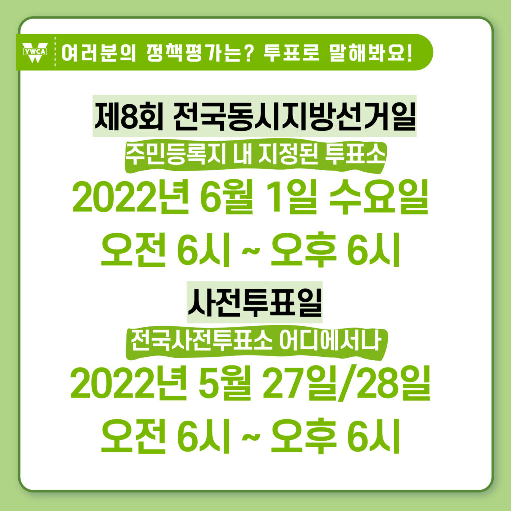 제8회 전국동시 지방선거가 한 달여 앞으로 다가왔습니다. 6월에 진행되는 전국동시 지방선거는 자치단체장, 지방의회 의원, 교육감 등이 선출되는 만큼 추후 4년간 각 지역 운영의 향방이 결정되는 중요한 선거입니다. 한국YWCA는 대통령선거와 더불어 지방선거 대응활동을 주요 운동 과제로 인식하고 작년부터 통합적으로 선거 대응활동을 전개해왔으며, 회원YWCA에서도 각 지역에서 대응활동을 전개하고 있습니다.