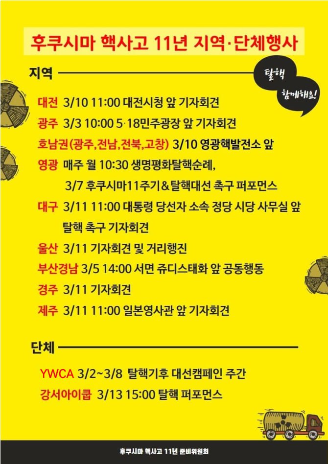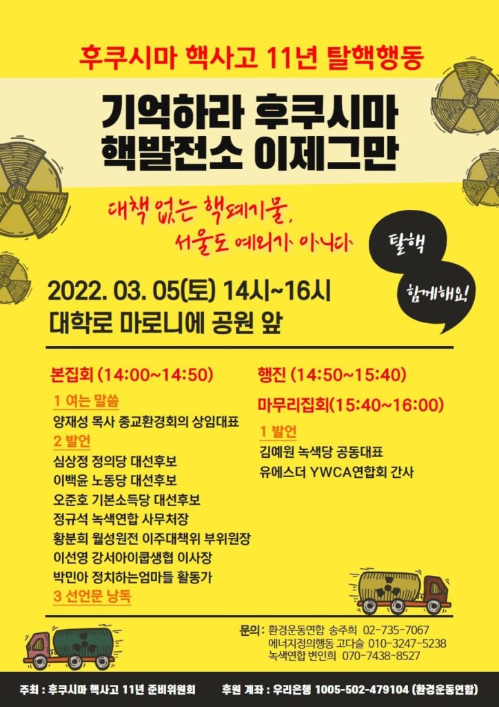 후쿠시마 핵사고 11년, 더 이상 비극이 반복되어서는 안 된다. 핵발전을 하루 빨리 멈추고 안전한 세상을 만드는 길, 탈핵을 향한 길은 계속 되어야 한다.