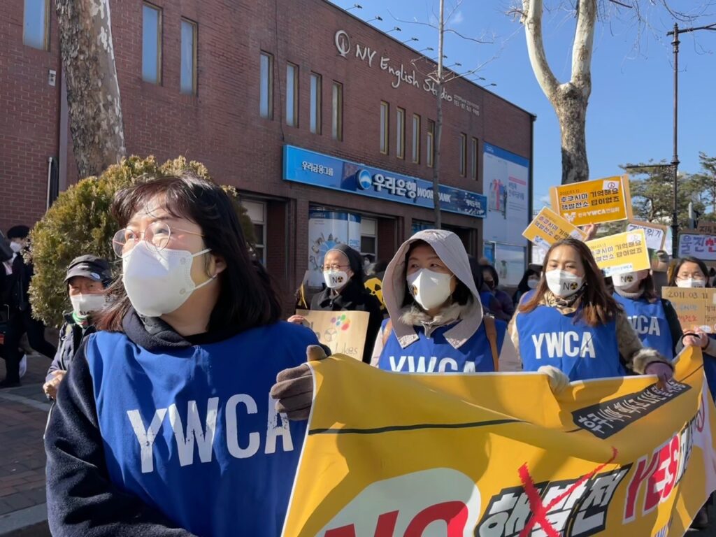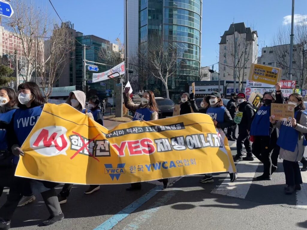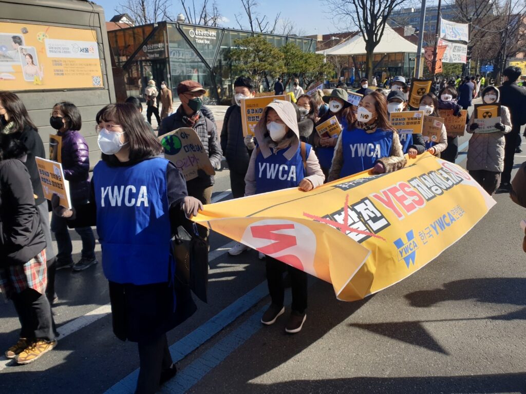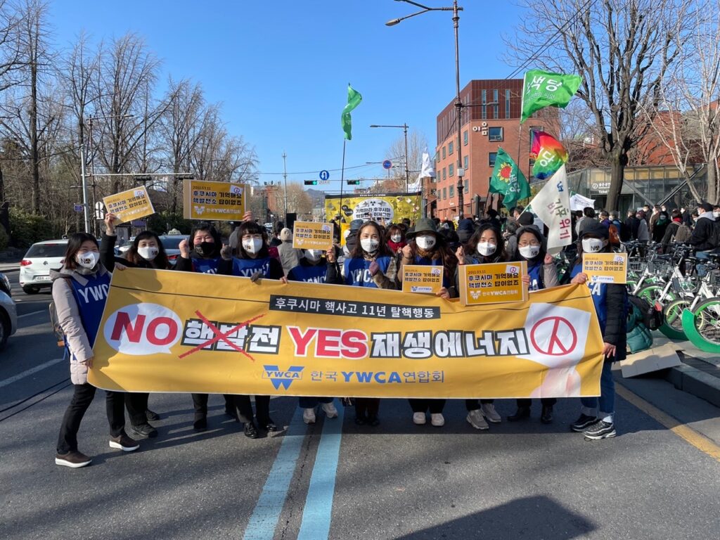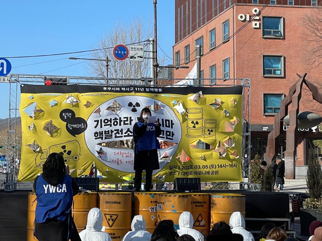 한국YWCA연합회가 연대하는 ‘후쿠시마 핵사고 11주년 준비위원회’는 2022년 3월 5일 서울 마로니에 공원에서 ‘탈핵행동 : 기억하라 후쿠시마, 핵발전소 이제그만’을 진행했다. 본 집회에는 한국YWCA연합회를 비롯 수원YWCA와 남양주YWCA 등 10여 명이 참석하여 시민들과 함께 혜화동 로터리와 이화사거리를 행진했다.