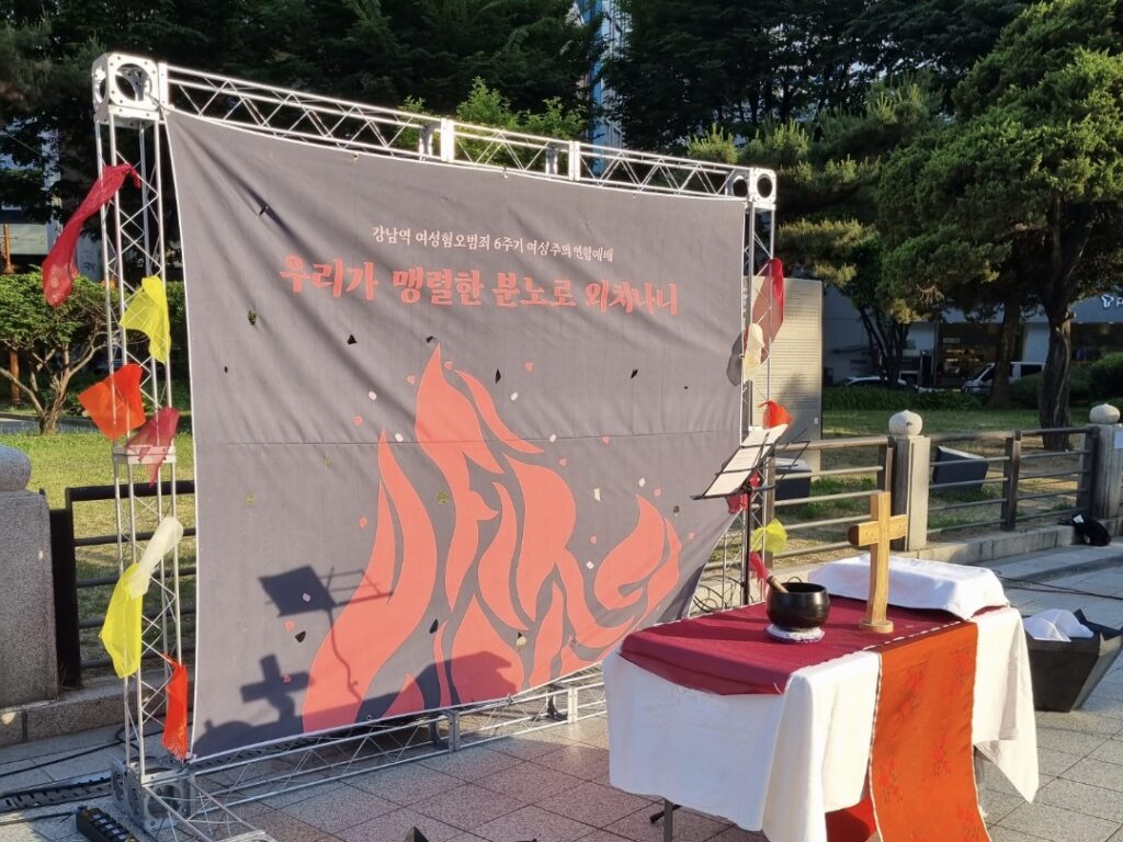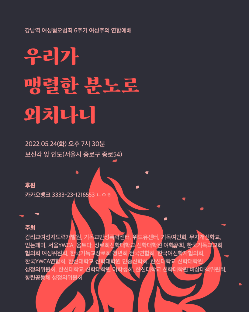 강남역 여성혐오범죄 6주기 여성주의 연합예배가 5월 23일(화) 저녁 7시 30분 보신각 앞에서 ‘우리가 맹렬한 분노로 외치나니’를 주제로 진행됩니다!