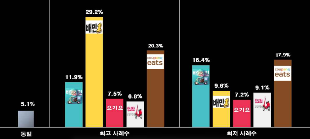 – 최고 배달비 배민1(배달의 민족 단건) > 쿠팡이츠 > 배달의 민족(묶음) 순으로 가장 많아