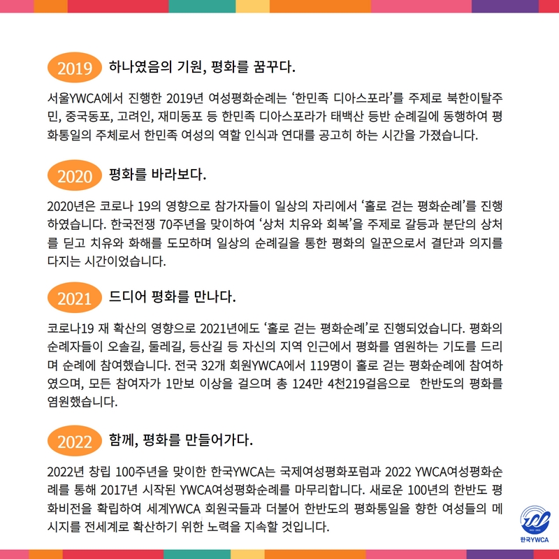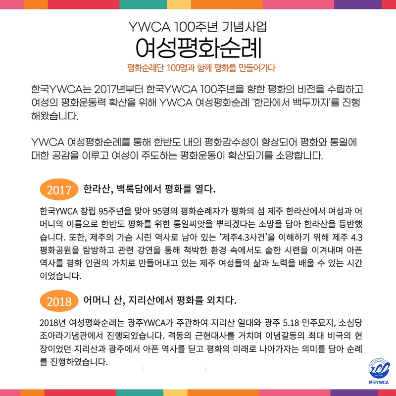 한국YWCA는 2017년부터 한국YWCA 100주년을 향한 평화의 비전을 수립하고 여성의 평화운동력 확산을 위해 YWCA 여성평화순례 ‘한라에서 백두까지’를 진행해왔습니다. YWCA 여성평화순례를 통해 한반도 내의 평화감수성이 향상되어 평화와 통일에 대한 공감을 이루고 여성이 주도하는 평화운동이 확산되기를 소망합니다.