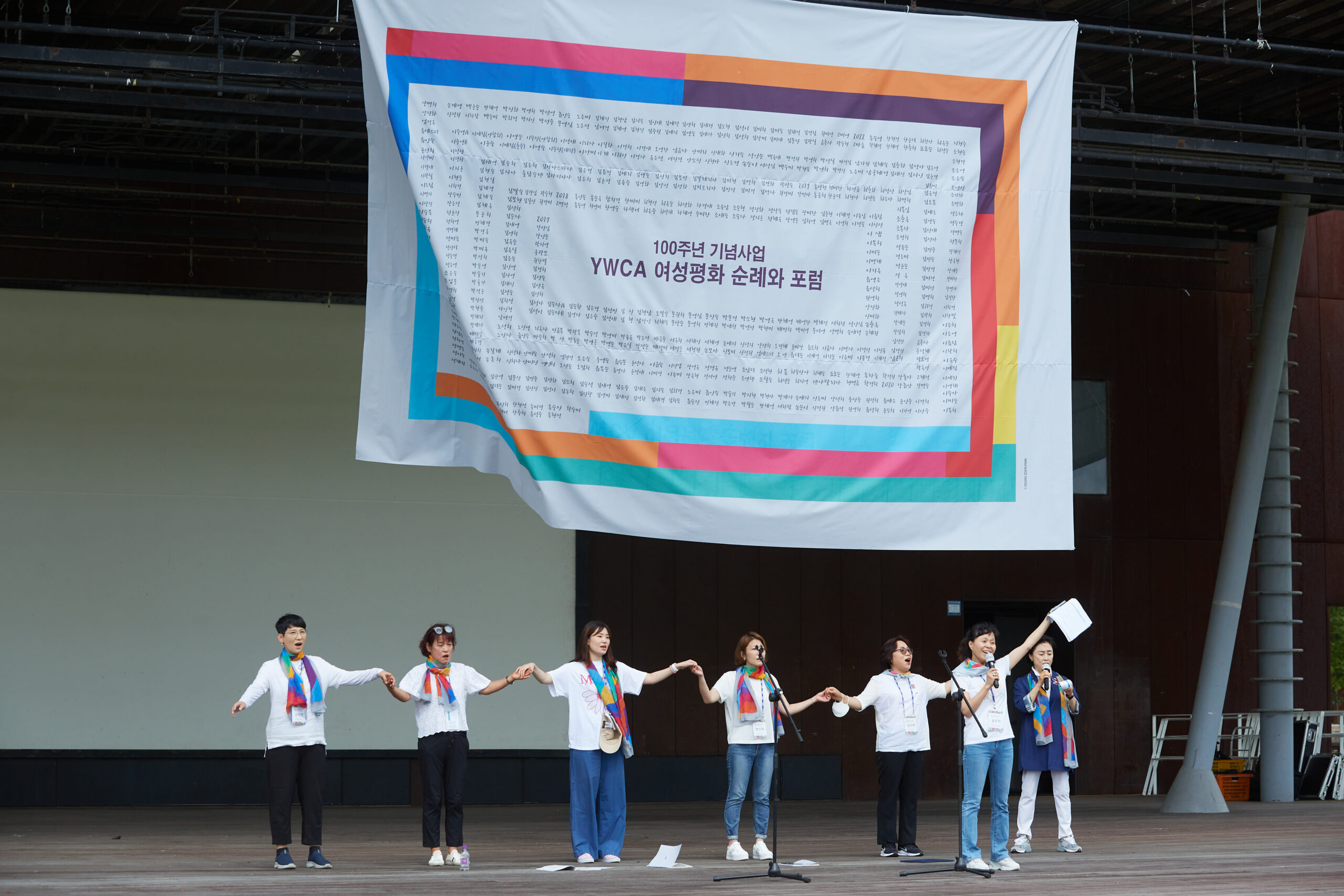 YWCA 여성평화순례 오프닝, 6년간의 평화순례단 585명의 명단이 적힌 현수막을 배경으로 하여 조각보 노래를 이어가고 있다.