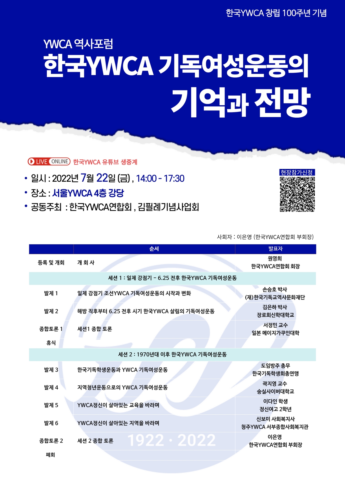 7월 22일(금) 오후 2시, 서울YWCA 4층 강당에서 진행하는 이번 포럼은 1922년 일제강점기 ‘여성해방과 민족 독립을 통한 하나님 나라 건설’이라는 YWCA 초창기 창립 정신과 목적, 시대적 상황에 굴복했던 역사적 과오, 그리고, 한국 전쟁 전후부터 현재까지 기독여성운동의 관점에서 ‘학생’, ‘청년’, ‘지역’ 등을 키워드로 YWCA운동의 기억과 전망을 살펴보는 내용으로 진행된다. 특별히 한국YWCA 창설자 중 한 분인 김필례 선생의 사역을 연구하고 그 업적을 기리며 널리 나누기 위한 사업을 추진하기 위해 설립한 김필례선생기념사업회와 공동주최로 개최하여 그 의미가 더 크다.