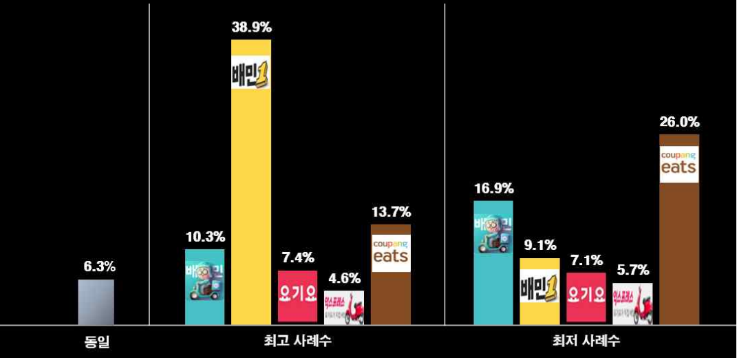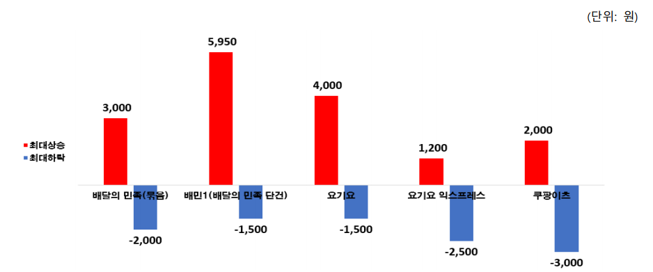 또한, 배민1의 배달비 인상 폭은 최대 5,950원이었고, 하락 폭은 최대 1,500원인 것으로나타났으며, 요기요의 경우 배달비 인상 폭이 최대 4,000원, 하락 폭이 최대 1,500원인 것으로 나타나, 눈에 띄는 결과를 보였다.