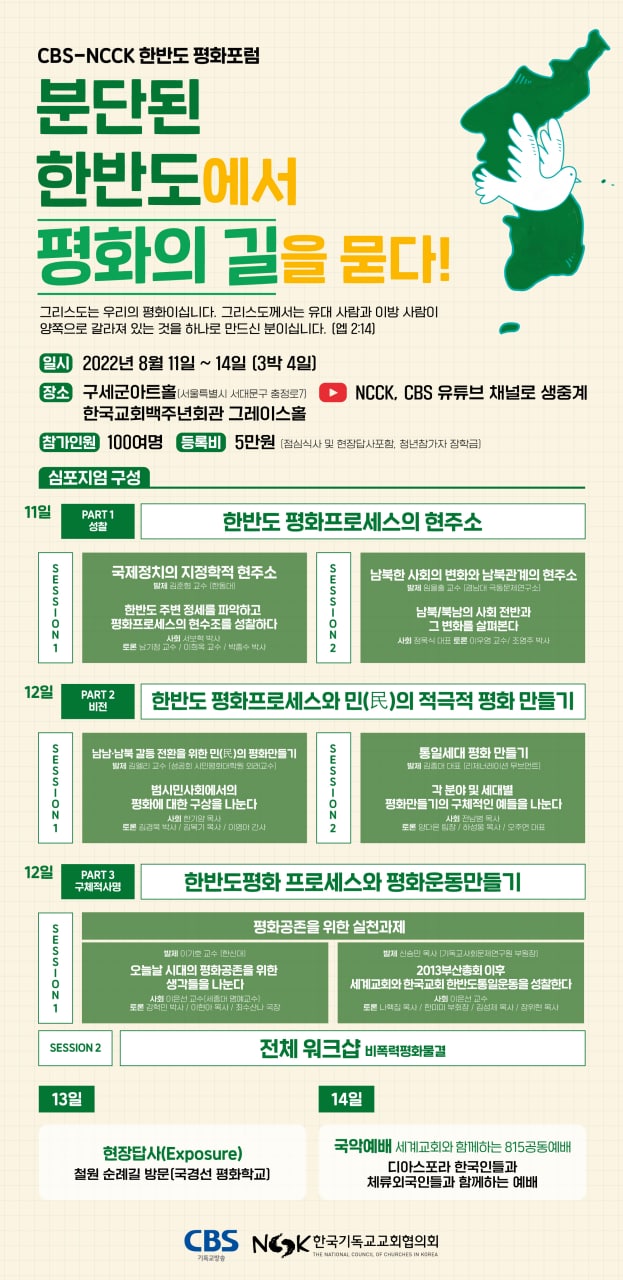 CBS-NCCK 협력으로 한반도 평화포럼이 8월 11일-14일 (3박4일간) 진행됩니다.