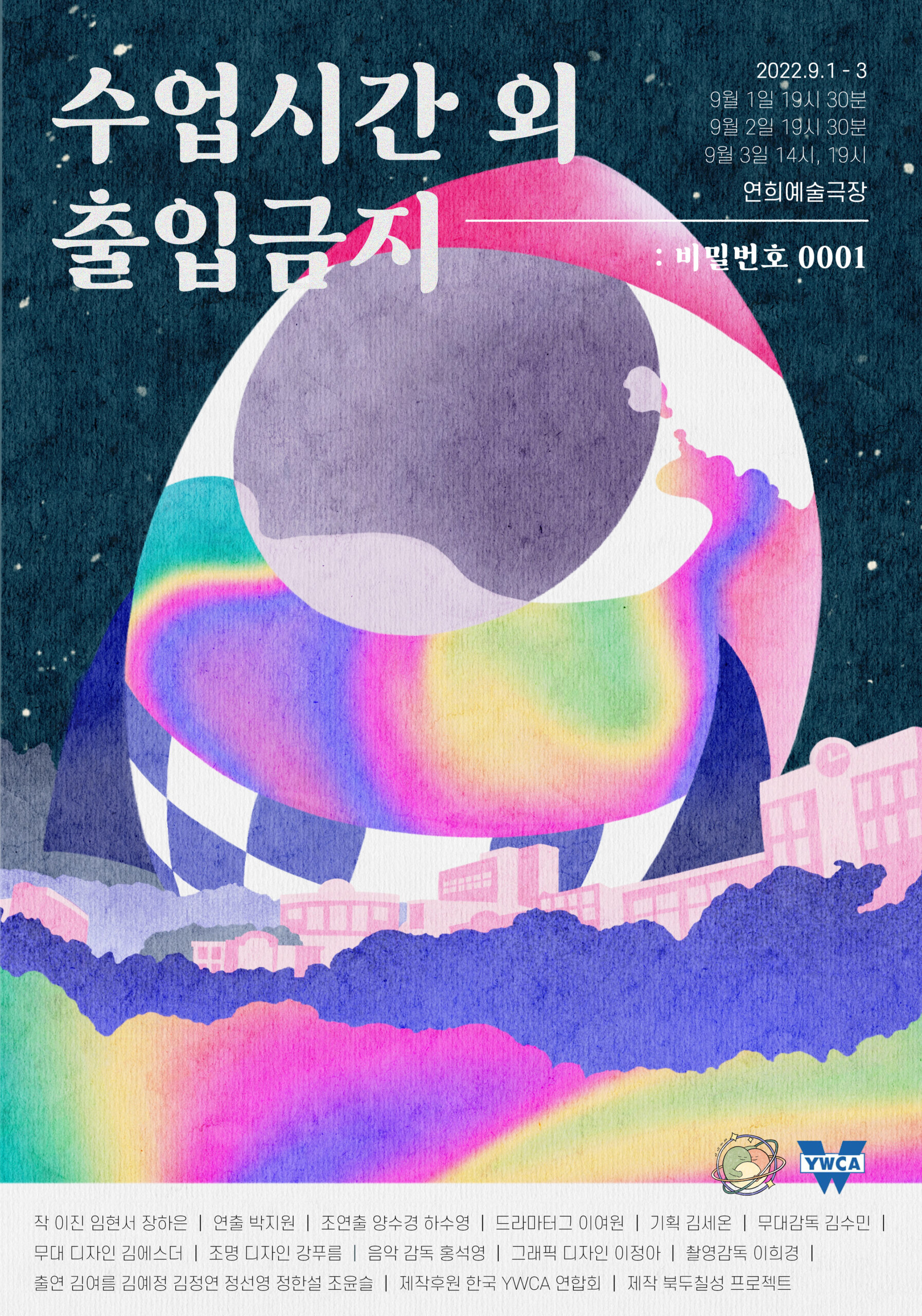 한국YWCA의 100주년 기념 사업 흥청망청(청년들이 흥하고 청년들이 소망하는 세상을 위한 100개의 프로젝트) 프로젝트의 13개 팀들 중, 북두칠성 팀에서 9월 1일 목요일부터 3일 금요일까지 공연을 진행합니다. 공연의 제목은 <수업시간 외 출입금지 : 비밀번호 0001>로 북두칠성 프로젝트 첫번째 공연입니다. 일상과 비일상 사이, 학교라는 공간에서 변곡점을 맞이하는 청소년들의 이야기를 세 편의 옴니버스 이야기로 다루며, 청소년 배우들과 함께 때로는 망원경으로 때로는 현미경으로 사건들을 들여다보며 우리가 지나야만 하는 어떤 시절에 대해 말합니다.