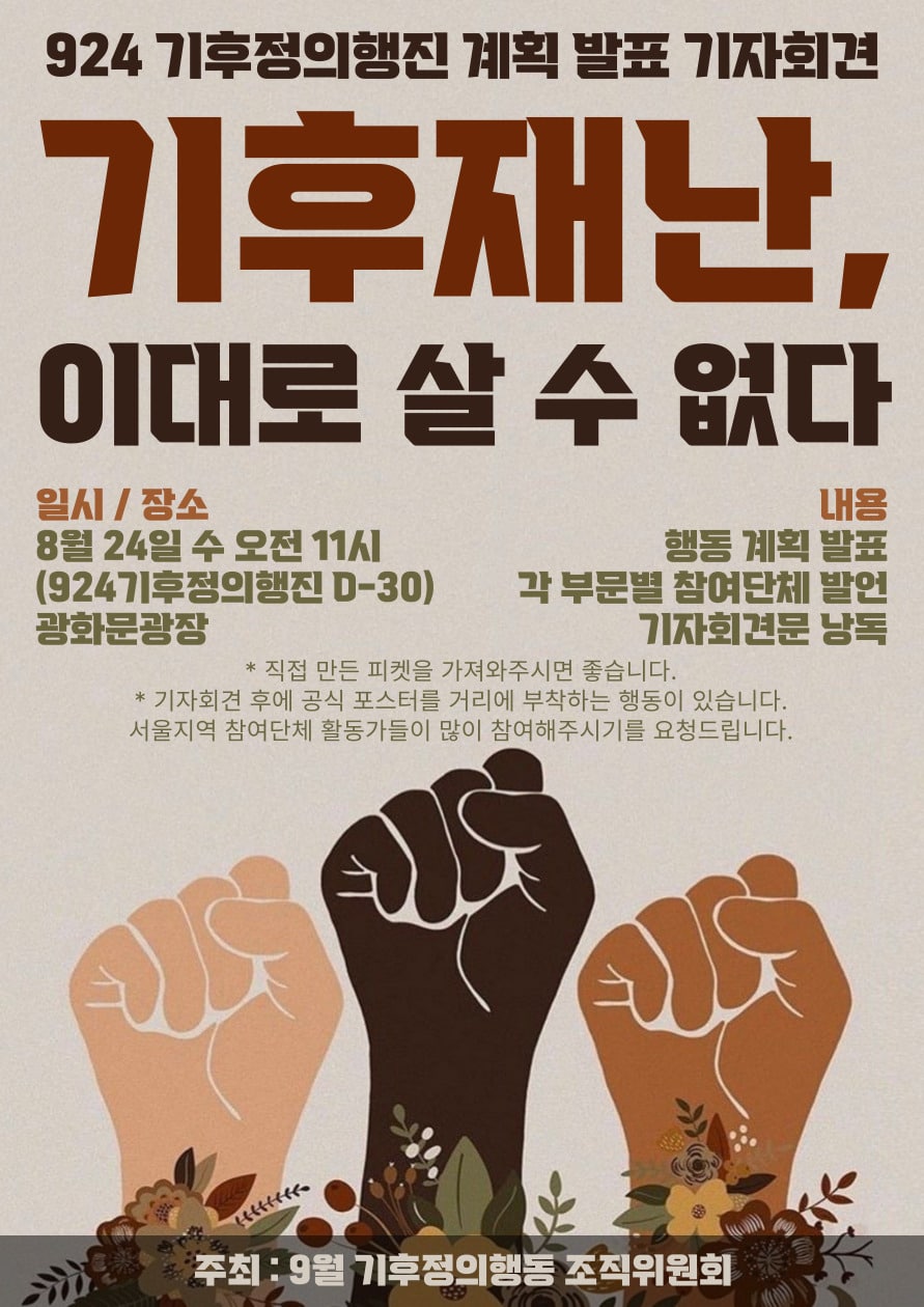 재난과 위기는 우리에게 두려움과 절망을 안겨주지만 ‘기후정의’는 기후재난을 겪는 세계를 함께 헤쳐나갈 방향이자 대안이다. ‘기후정의’는 우리가 누구에게 책임을 묻고, 무엇을 변화시켜야 할지, 대안을 어떻게 만들어가야 할지 알려주는 방향타다. 우리는 막대한 온실가스 배출 책임이 있는 자본 권력에 적정한 책임을 부과하고, 정부가 불평등한 체제를 종식하도록 하는 기후정의행동을 시작한다. 9월 24일, 우리는 서울 광화문에서 모여 ‘기후정의’를 외치며 싸울 것이다. 기후위기에 공감하고 기후정의를 실현하기를 갈망하는 모든 시민들은 광화문 거리로 모여달라. 이대로 살 수는 없다.