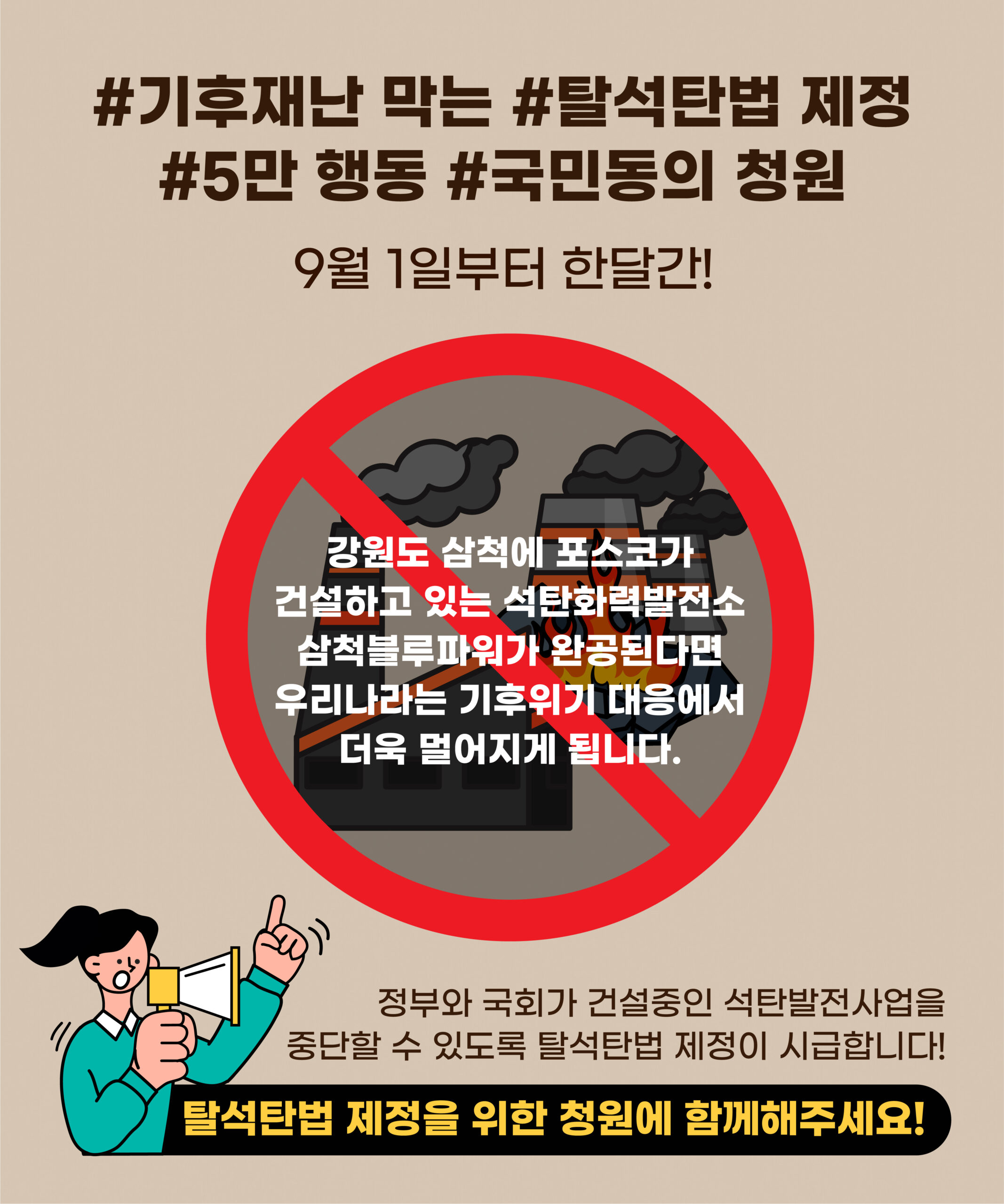 오늘을 시작으로 9월 한 달간 탈석탄법 제정을 위한 국민동의청원을 통해 우리의 요구를 국회에 직접 전달하고자 합니다. 기후위기를 염려하는 시민 5만 명의 동의가 모아 진다면 탈석탄을 앞당길 수 있습니다. 지금 바로 청원에 동참해주세요!