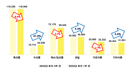 품목별로 보면 채소/임산물 품목이 추석 3주 전 72,178원에서 추석 1주 전 조사 69,525원으로 3.7% 하락하여 다른 품목에 비해 상대적으로 크게 떨어졌다. 이외에 가공식품은 33,660원에서 33,232원으로 1.3% 하락, 축산물은 119,228원에서 118,569원으로 0.6% 하락하여, 매우 적은 폭으로 가격이 하락한 것을 파악할 수 있었다. 반면 과일류는 43,962원에서 45,903원으로 4.4% 상승, 기타 식품은 29,354원에서 31,001원으로 5.6% 상승, 수산물은 19,715원에서 25,038원으로 27.0% 큰 폭으로 상승하였는데 이는 참조기가 3주 전 평균 4,948원이었으나 이번 조사에서는 평균 10,692원으로 116.1% 큰 폭으로 상승해 수산물 상승 폭이 가장 눈에 띄는 것으로 나타났다. 전체적으로 추석 3주 전 대비 1주 전 채소/임산물(-3.7%), 가공식품(-1.3%), 축산물(-0.6%) 하락 폭에 비해 과일류(4.4%), 기타 식품(5.6%), 수산물(27.0%)의 상승 폭이 더 큰 것으로 나타나, 명절 물가를 앞두고 정부에서 시행 중인 물가 안정 대책에 실효성이 미미한 것으로 보여졌다.
