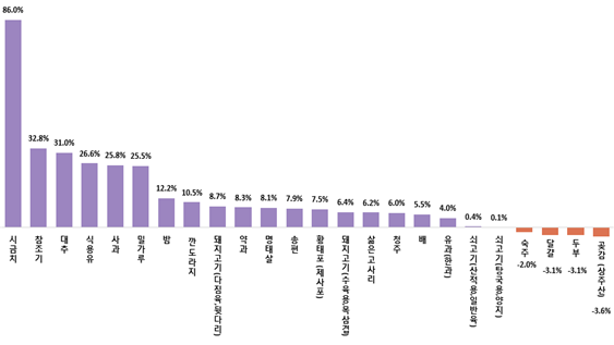 – 채소와 가공식품 상승 두드러져, 개별 품목으로는 시금치(86.0%) > 참조기(32.8%) > 대추(31.0%) 순