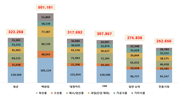 – 전통시장(252,656원) < 일반 슈퍼마켓 < SSM < 대형마트 < 백화점(501,181원)