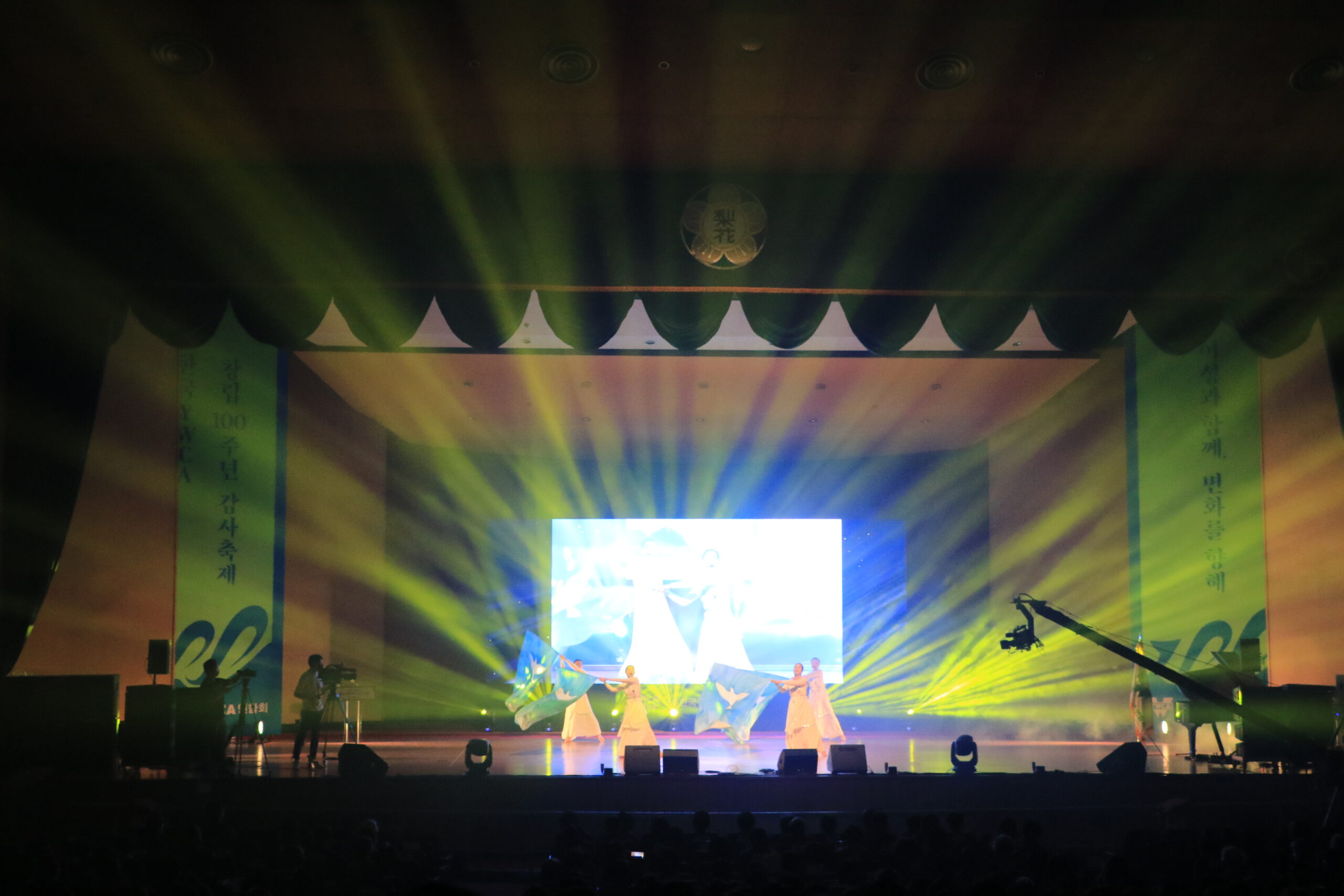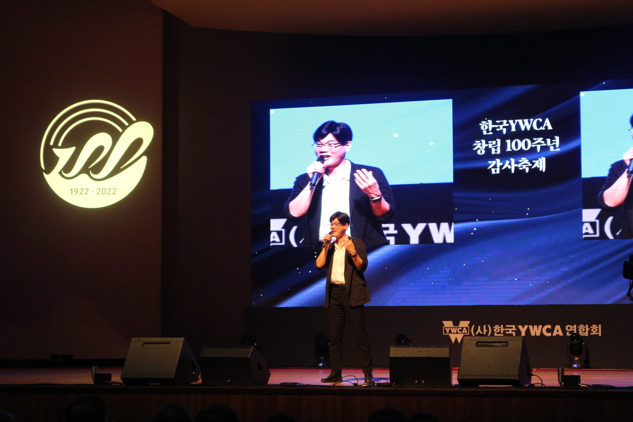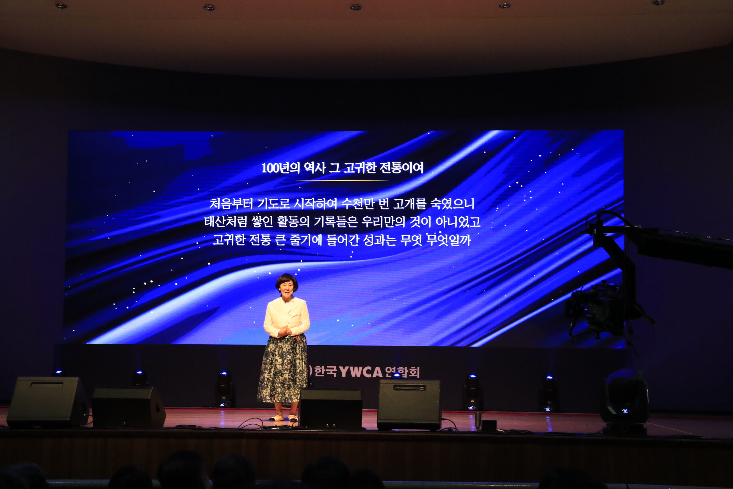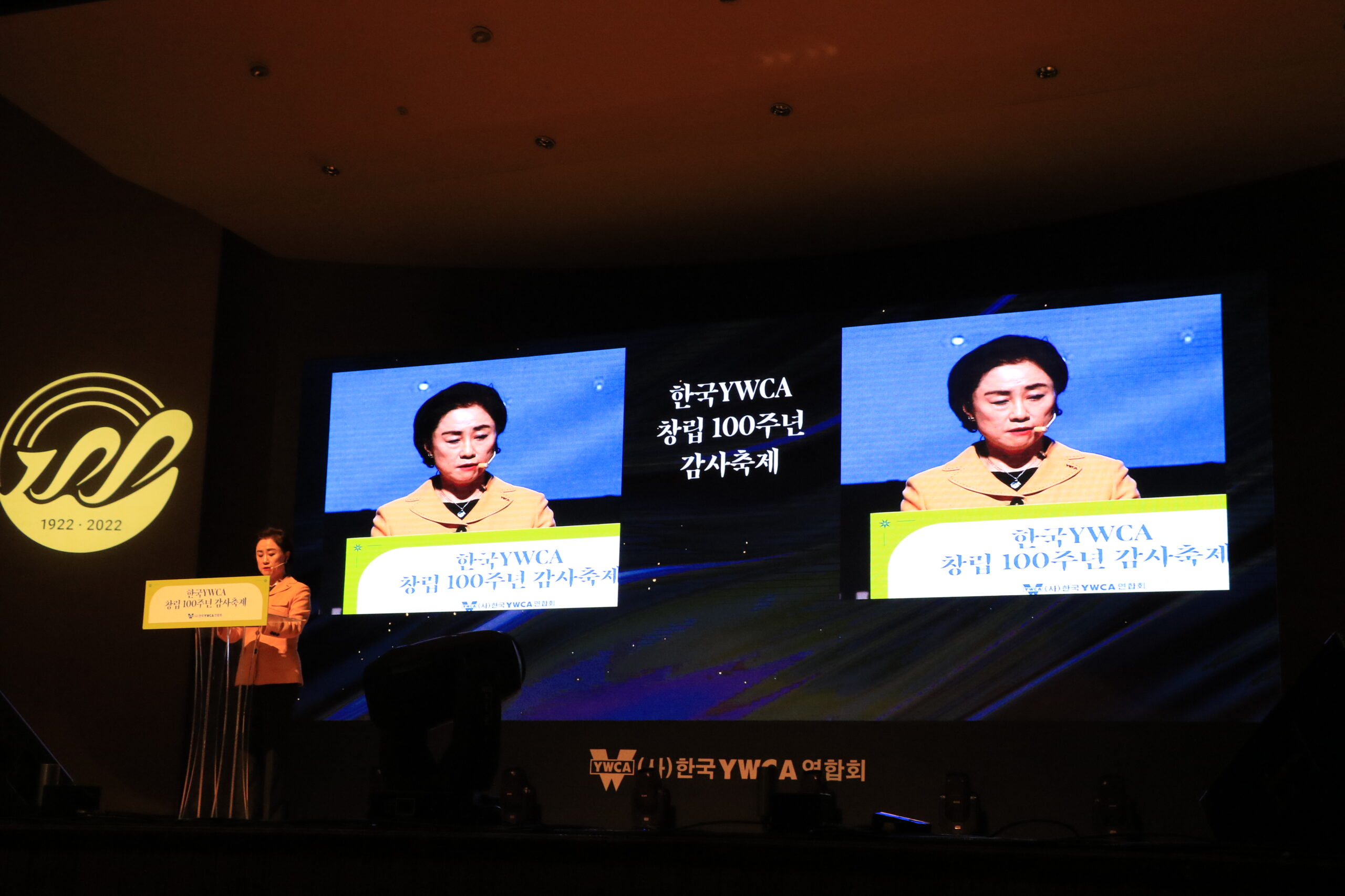 한국YWCA 창립 100주년 감사축제는 CBS 김용신 아나운서의 사회로 원영희 회장의 개회기도와 환영사, 김재화 시인의 100주년 축하시, 소리엘 장혁재님의 찬양으로 시작했다. 원영희 회장은 환영사에서 “한국YWCA 100년은 우리들만의 100년이 아니라 여성운동의 100년이요, 기독여성운동의 100년”임을 언급하며 “연합회와 52개 회원YWCA의 모든 활동가들과 회원들, YWCA의 정의, 평화, 생명운동에 함께해 주신 시민들이 함께 맞는 100주년” 임을 강조했다. 이날 감사축제는 100년의 여정에 함께한 자원활동가와 실무활동가, 봉사와 헌신으로 함께한 개인과 기관에 대한 시상식, 축하공연으로 이어졌으며, 마지막 퍼포먼스로 100주년 엠블럼( “YWCA 100주년, 여성과 함께 변화를 향해!”)을 전달하며 미래세대에게 100년 이후 YWCA가 순항하도록 기원했다.