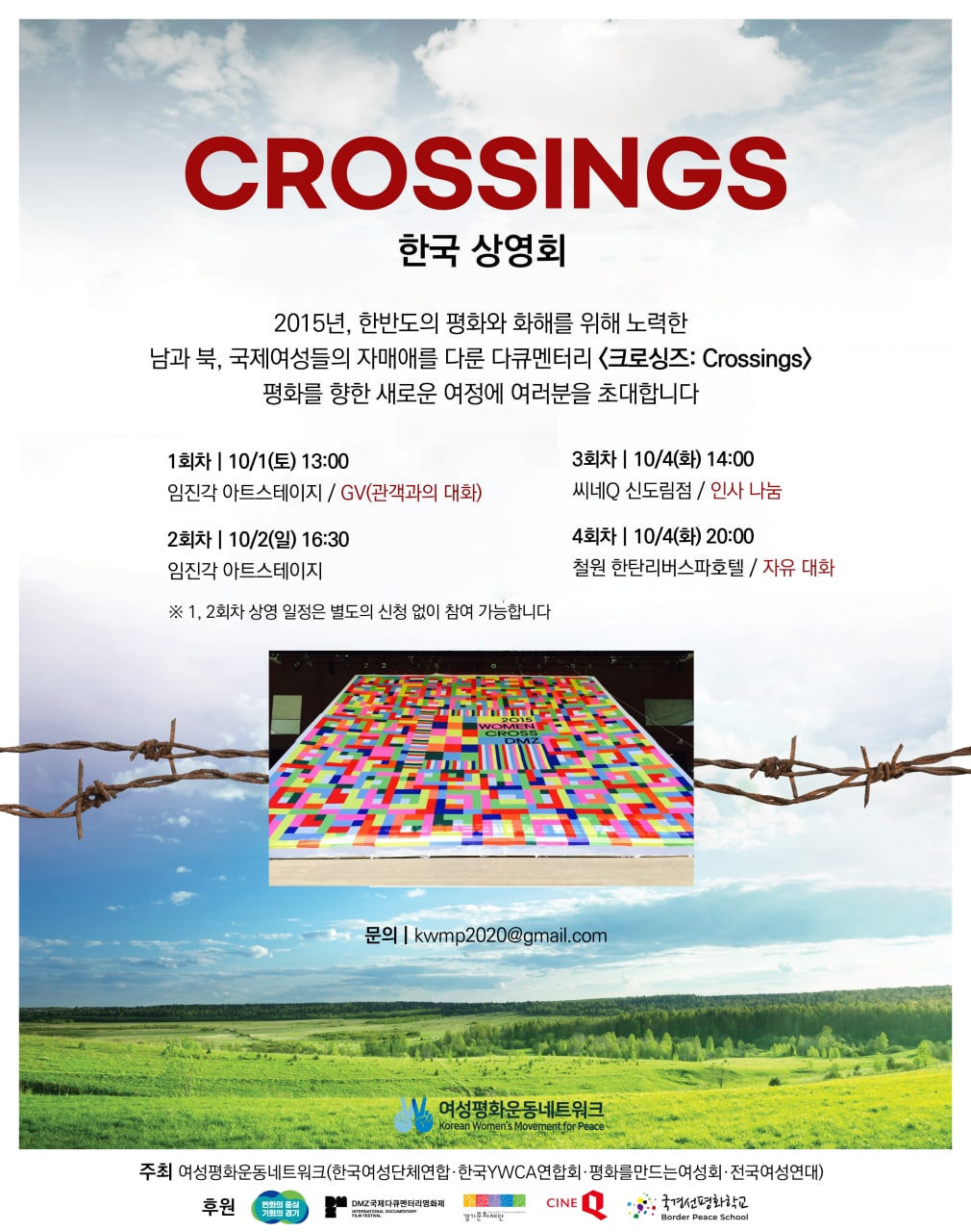 2015년 전 세계 15개국 30여 명의 국제여성평화활동가들이 한반도의 전쟁 종식과 평화로운 한반도와 동북아를 위해 북에서 남으로 DMZ를 건너는 위험한 횡단이 진행되었습니다. 이에 대한 이야기를 다룬 영화인 <Crossings>의 한국 상영이 확정되었습니다. 메어리드 맥과이어, 리마 보위 등 노벨평화상 수상자, 글로리아 스타이넘, 크리스틴 안 등 저명한 평화운동가들로 구성된 이 용감한 여정은 어마어마한 물적, 정치적 도전과 다양한 어려움 속에서도 평화와 화해를 위한 남, 북, 국제여성들의 자매애를 다루고 있습니다.