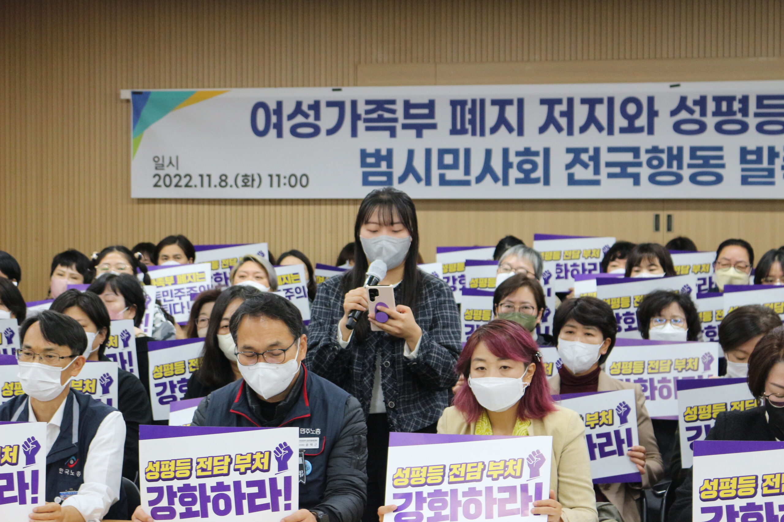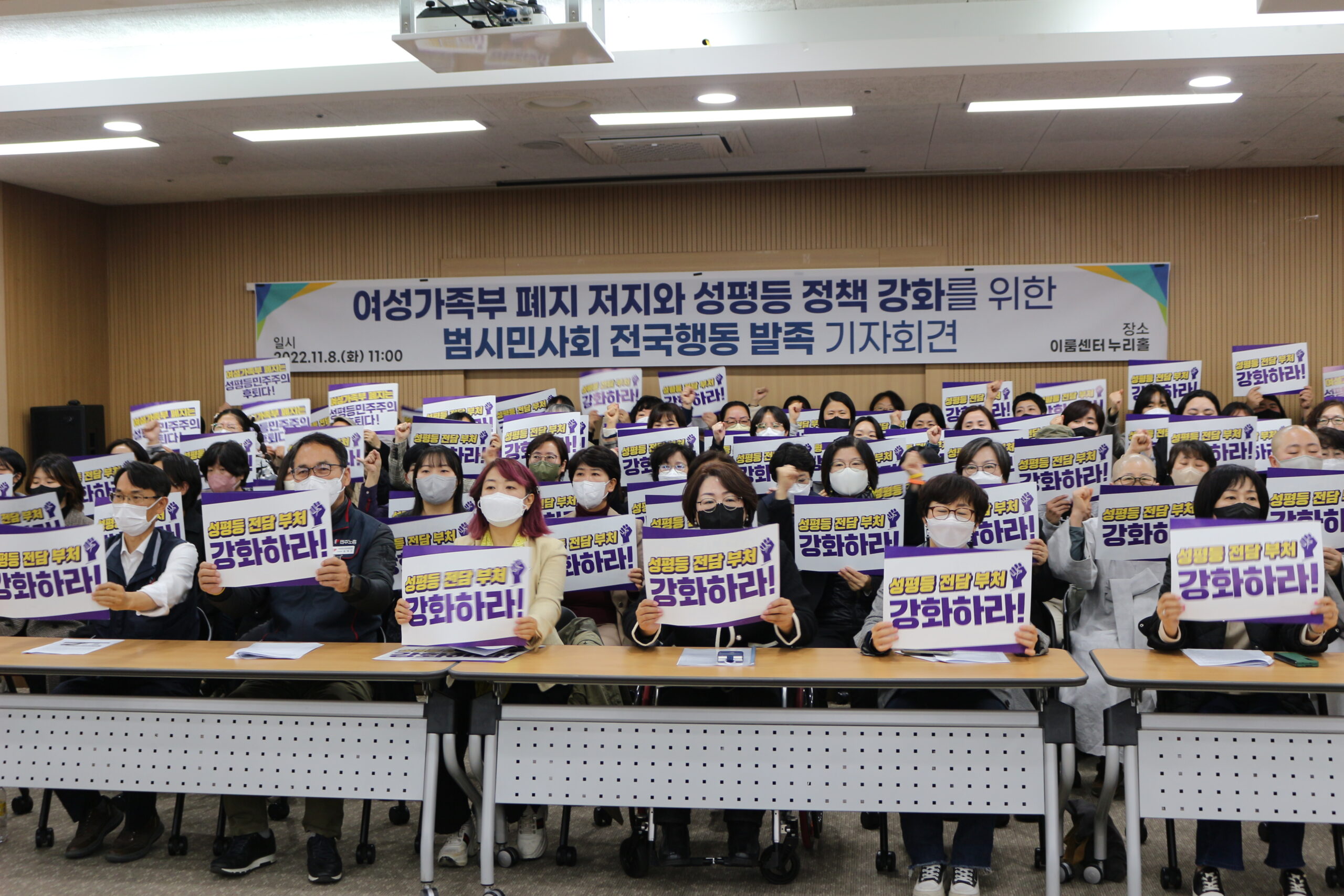 여성가족부 폐지 저지와 성평등 정책 강화를 위한 범시민사회 전국행동이 11월 8일(화) 오전 11시 여의도 이룸센터 누리홀에서 한국YWCA연합회와 전국 52개 회원YWCA 및 전국 650여 시민단체의 뜻을 모아 전국행동 출범에 나섰다.