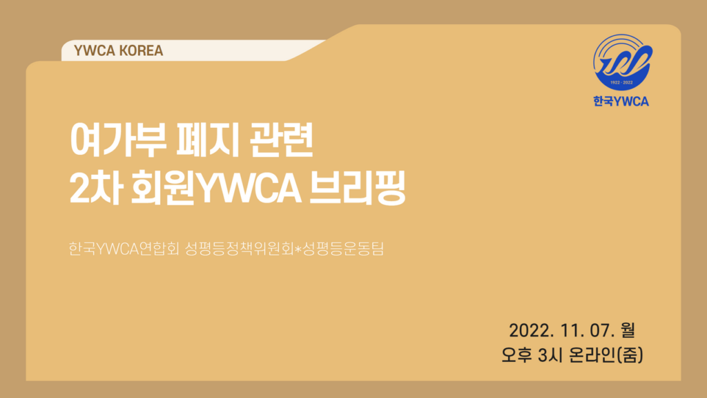 지난 11월 7일(월) 오후 3시 온라인(줌)에서 여성가족부 폐지 관련 2차 회원YWCA 브리핑이 진행되었습니다.