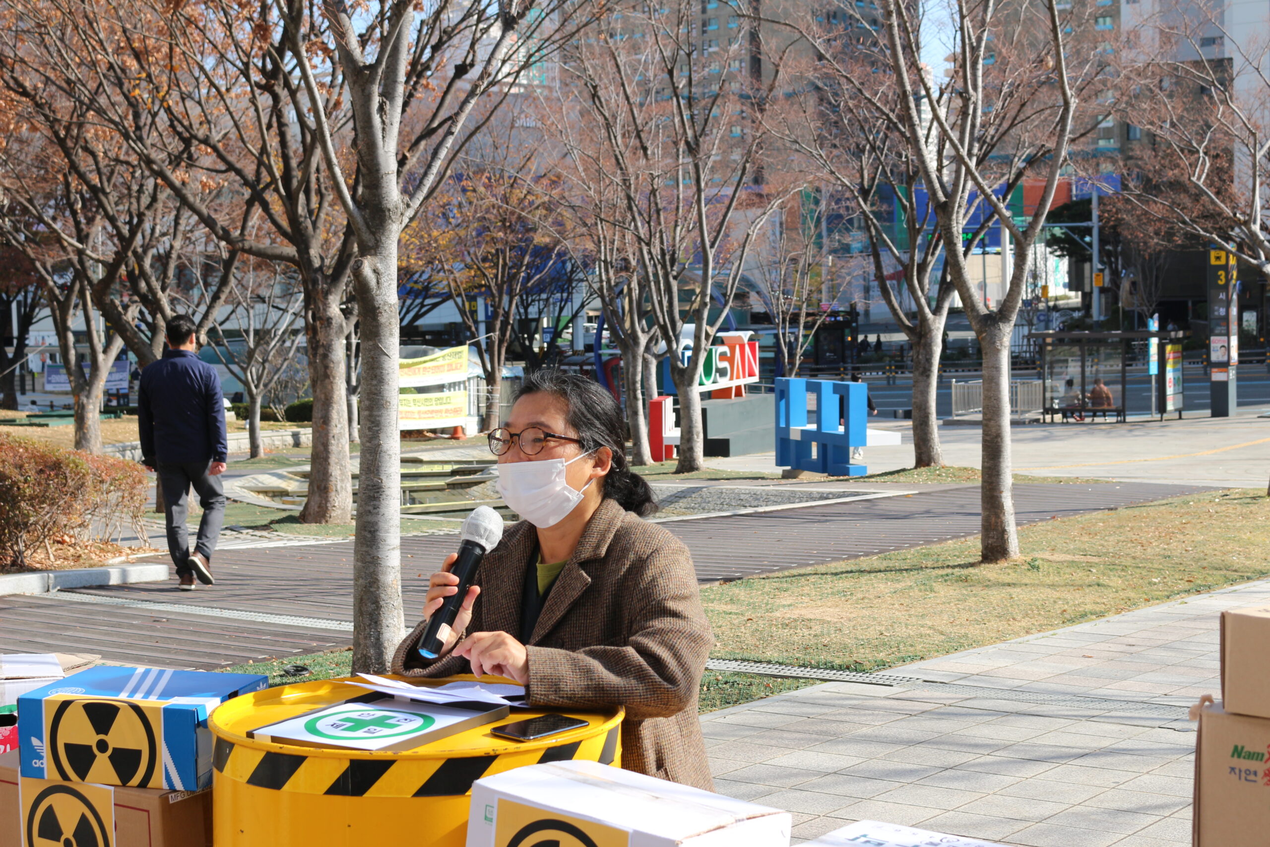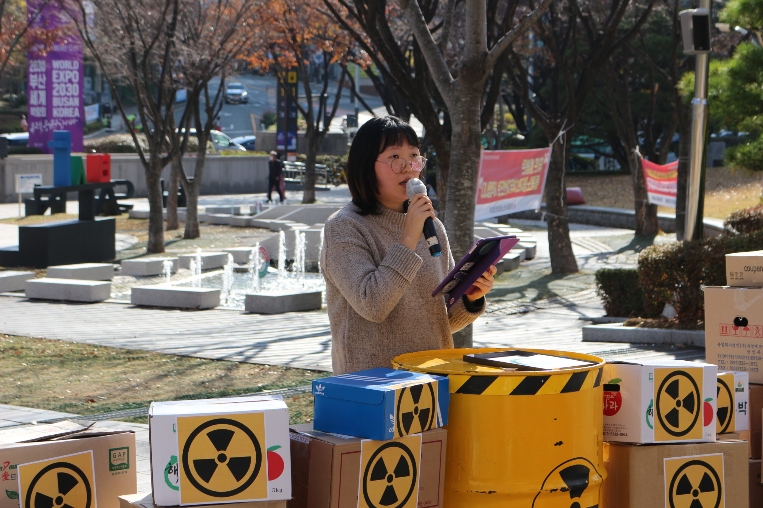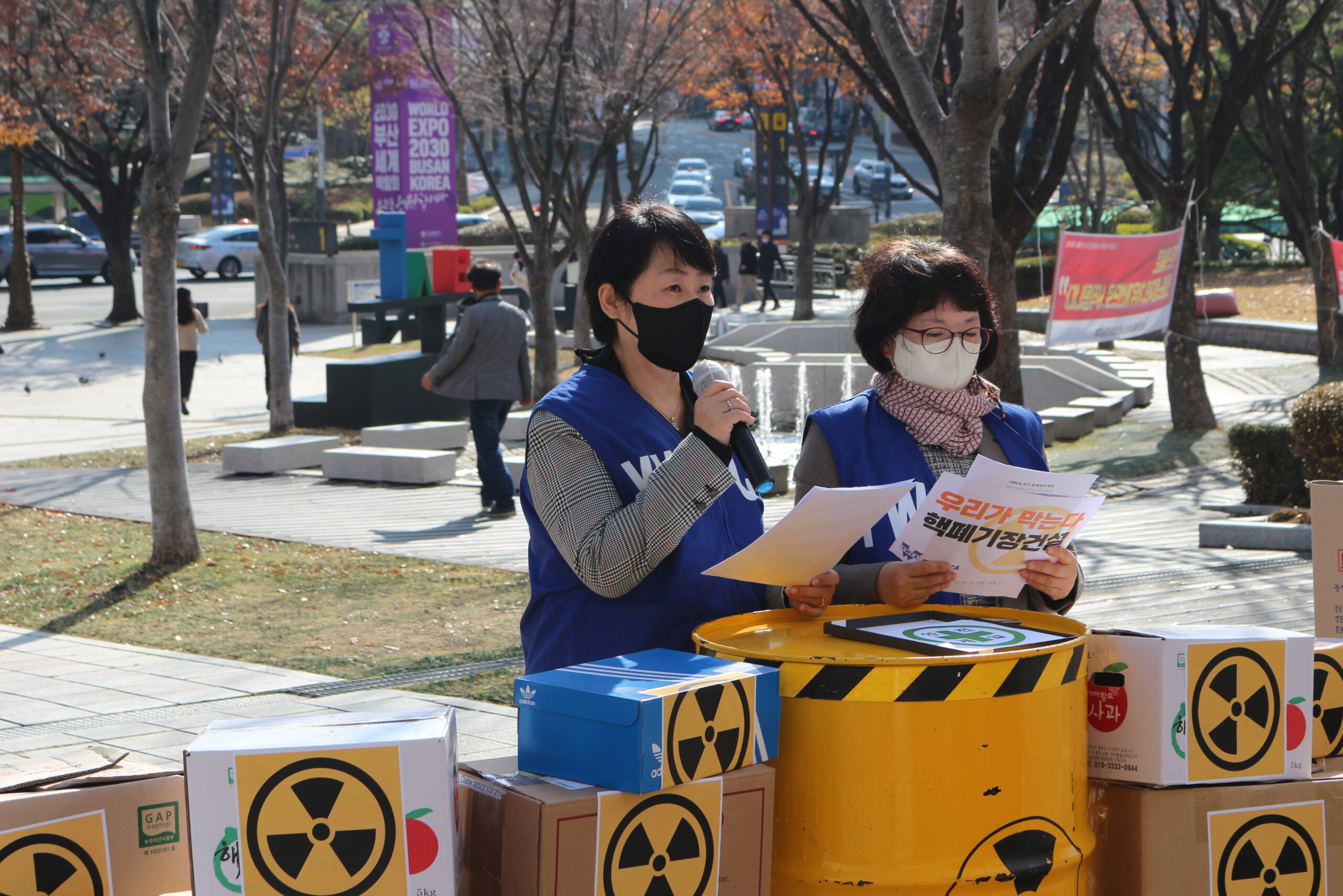 이어서는 현장의 발언이 이어졌다. 부산YWCA 김혜진 제1부회장과 부산YWCA 김정환 사무총장은 우리의 성명서 <고리2호기 수명연장 및 핵폐기장 건설 반대한다>는 성명서를 통해 “2023년 4월 수명이 끝나는 고리2호기의 수명연장은 원자력안전법에 명시된 수명연장을 위한 주기적안전성평가 제출 시한을 지키지 않고, 여러 문제점을 가지고 있는 부실한 방사선환경영향평가를 주민의견수렴조차 거치지 않고 제출한 후 뒤늦게 졸속으로 시행하고 있다.”며 노후원전의 수명연장과 핵폐기장 건설로 부산시민의 생명과 안전은 위협받고 있음을 알렸다.