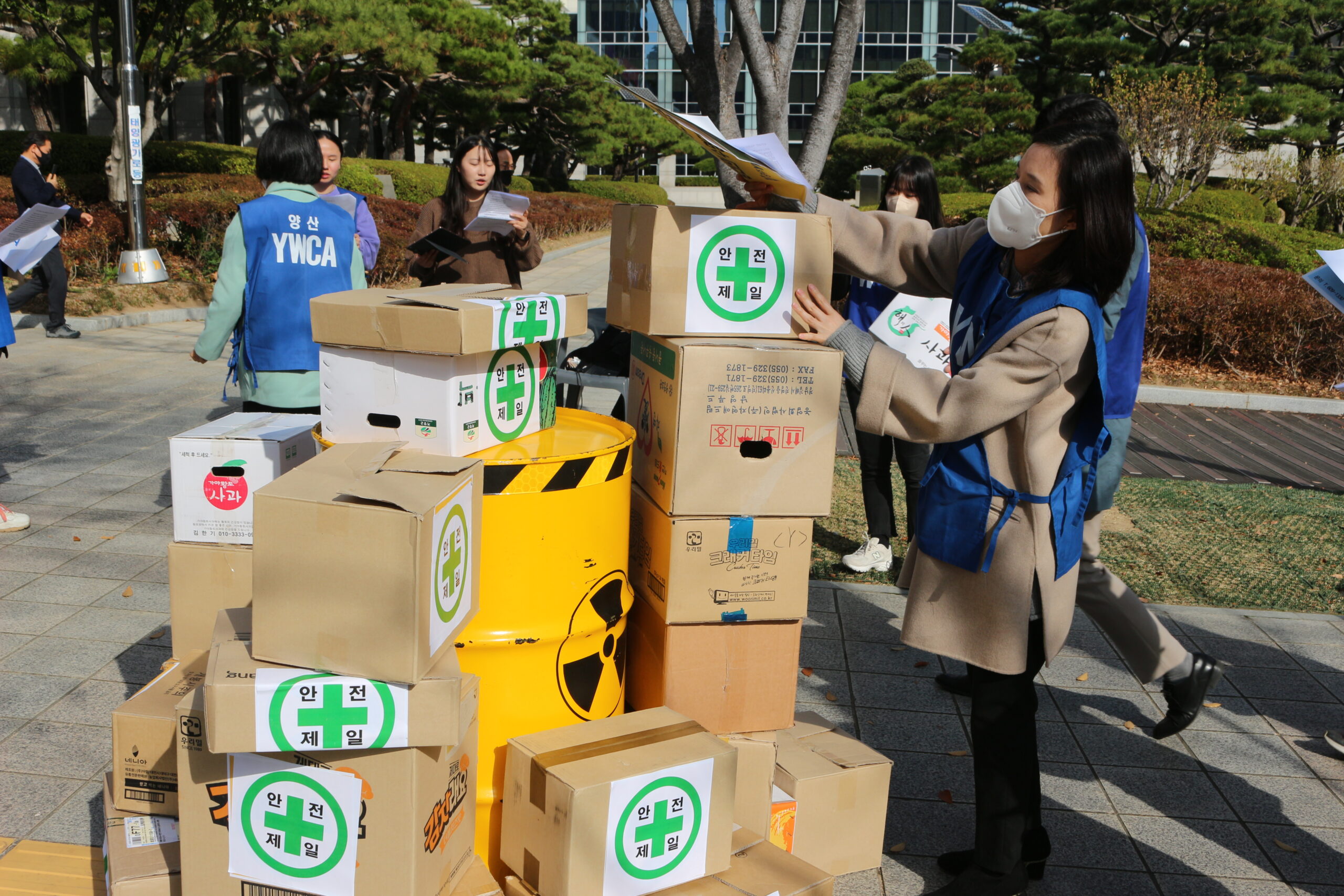 현장의 발언 이후 참여자들은 준비된 핵폐기물을 나타내는 상징물을 자신의 자리로 가져와 그 위에 안전스티커를 붙이며 모두가 안전할 수 있는 사회를 만들기 위한 결단의 목소리를 높였다.