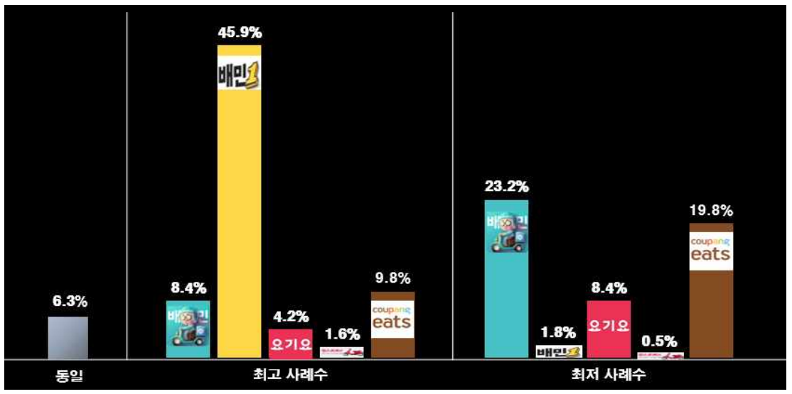 소비자가 동일한 조건에서 지불하는 배달비를 비교한 결과, 배달앱, 배달서비스에 따라 배달비 차이가 나는 경우는 93.7%였으며 똑같은 경우는 6.3%뿐이었다. 최고 배달비가 가장 많은 앱은 본 협의회의 이전 조사 결과들과 마찬가지로 배민1(배달의 민족 단건, 이하 배민1)이 45.9%로 가장 많았고 그다음으로 쿠팡이츠가 9.8%로 많았다. 최저배달비가 많았던