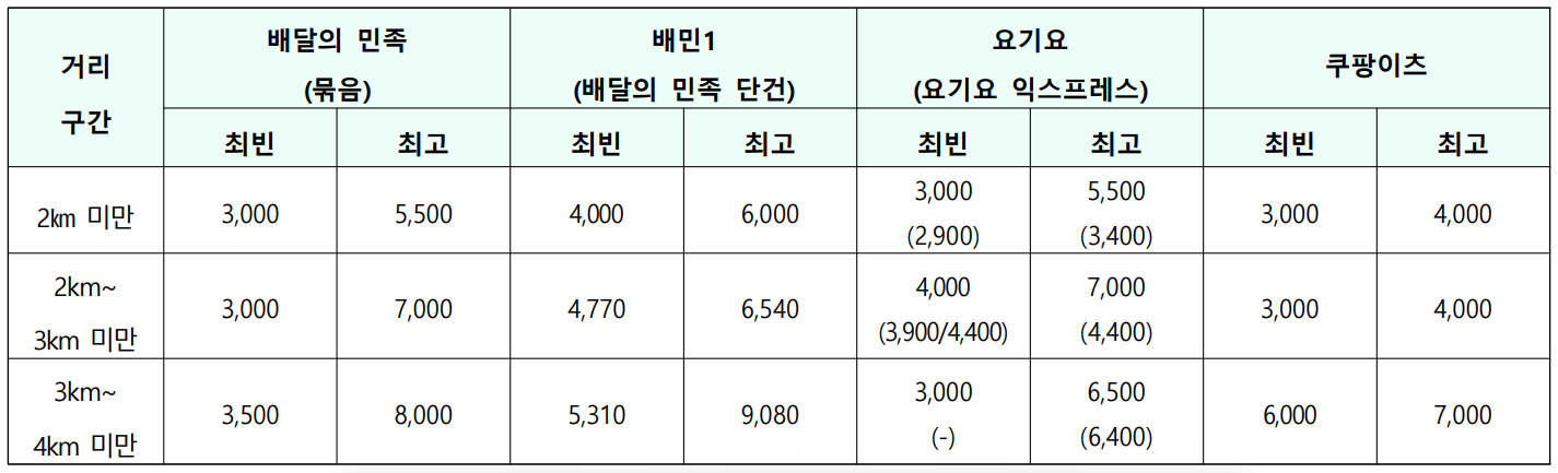 <표 2. 배달 거리에 따른 배달앱, 배달서비스에 따른 배달비 현황>