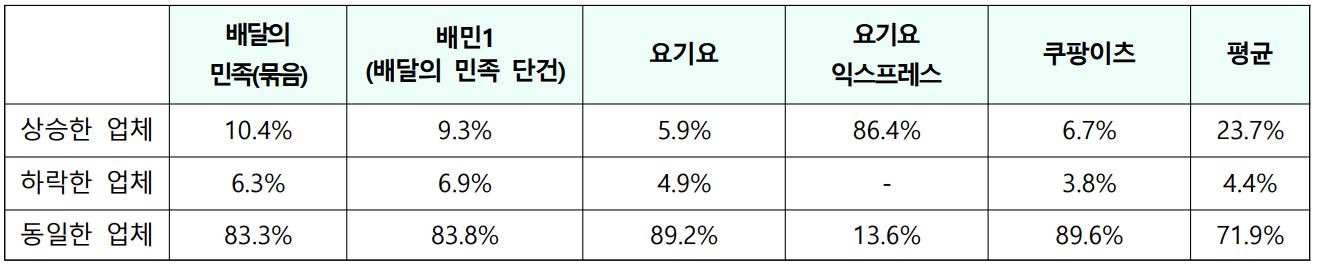 – 배달비 인상 업체들은 평균 731원, 인하된 업체들의 평균 가격은 718원 변동해