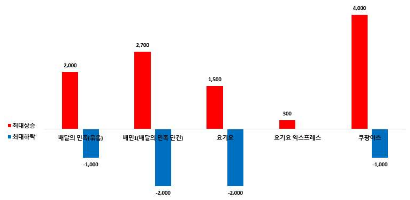 2) 최고, 최저 배달비는 3개 이상 배달비 중 top, bottom의 가격이 각 1개씩 있을 경우의 배달앱만 표시함.