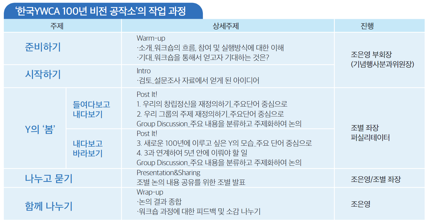 지난 100년의 역사를 살아내고 창립 100주년을 맞이한 지금, 새로운 100년의 출발선에 선 한국YWCA는 100년 전 ‘새 하늘과 새 땅’의 꿈을 꾸었던 여성들처럼 새로운 100년의 꿈을 꾸고 준비하기 위한 비전 워크숍을 ‘고백과 성찰’, ‘Y’, ‘W’, ‘C’, ‘A’ 다섯 개의 주제로 진행했다.