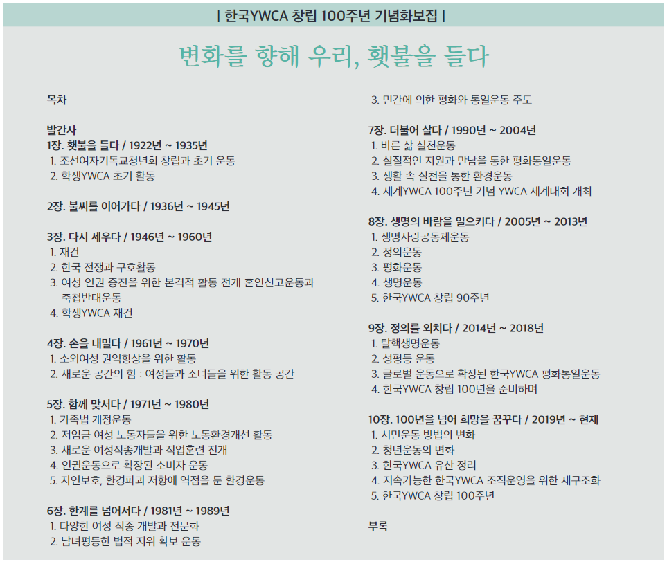 한국YWCA 창립 100주년을 기념하며 발간한 화보집 ‘변화를 향해 우리, 횃불을 들다’는 100년의 역사 속에서 전개한 YWCA 운동의 의미와 가치, 과정과 결과를 사회·역사적 배경에서 정리하고 생생한 시각적 자료인 사진으로 보여주기 위하여 제작하였습니다. 화보집은 YWCA 역사를 기독운동사적 관점을 기초로 하여 총 10개의 연대기로 구분하고 역사 속에서 YWCA가 주체가 되어 사회변화를 일궈낸 과정과 결과를 중심으로 특징적인 주제를 잡아 각 연대기의 주제가 부각될 수 있도록 구성하였습니다.