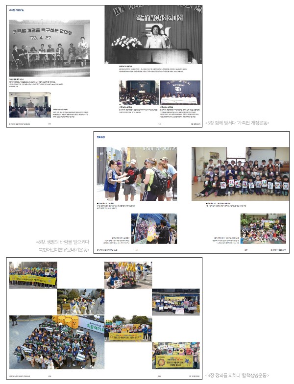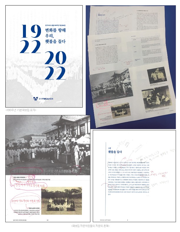 화보집을 준비하면서 우리 활동의 기록이 정말로 중요하다는 생각과 무엇보다 그 기록을 분실하지 않고 훼손되지 않게 잘 보관하는 것의 중요성을 다시금 절감하는 시간이었습니다. 그런 의미에서 한국YWCA 창립 100주년을 준비하며 그리고 역사 속에서 활동한 많은 선배들이 있는데 소수의 대표적인 인물들의 이름만 알고 대다수의 이름은 확인하기 어렵다는 현실에 마음이 아팠습니다. 그래서 이번 화보집에서는 가능한 한 사진 속 인물들을 파악하여 기록하기 위해 노력하였습니다. 앞으로 사진 속 인물들의 정확한 정보 파악을 위한 작업도 필요하리라 생각합니다. 우리는 화보집에 담긴 사진들을 통해 우리가 직접 경험하지 못했던 역사적인 사실에 대한 인식과 그 현장에 맞닥뜨림을 통해 다양한 감정들을 느낄 수 있으리라 생각합니다. 변화에 대한 절박함 때로는 숙연함과 비장함, 해낼 수 있다는 자신감과 용기, 함께라서 느끼는 연대감과 동지애, ‘그 땐 그랬지’ 하는 회상 또는 그리움, Y라는 공동체의 힘 등. 무엇보다 사진 뒤에서 보이지 않는 곳에서 함께 하며 변화를 외치는 수많은 여성들이 있다는 사실을 우리는 기억해야 합니다.