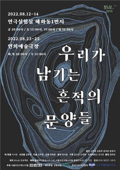 대학로에 있는 혜화동 1번지에서 8월 12일(금)부터 14일(일)까지 공연된 ‘우리가 남기는 흔적의 문양들’은 연극을 통해 기후위기 시대에 각자의 자리에서 어떻게 사회적 책임을 다할 수 있을지를 사유할 수 있도록 구성한 창작극이다. 한국YWCA연합회에서 올해 창립 100주년을 맞아 시작한 ‘세상을 살리는 100개의 프로젝트 – 흥청망청’의 13개 팀 중의 하나인 보노보 프로젝트팀 작품이다.