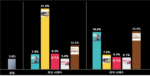 배달비를 배달 거리별로 분석한 결과, 앱별 배달비 최빈값을 보면 2km 미만 거리에서는 배달의 민족(묶음)과 요기요가 2,000원으로 다른 앱들에 비해 상대적으로 저렴한 편이었고 배달앱측에서 주문부터 배달라이더까지 원스톱으로 진행되는 배민1, 요기요 익스프레스, 쿠팡이츠의 배달비는 높은 편으로 조사되었다. 2km 이상~3km 미만 배달 거리에서의 최빈 배달비를 비교하면 요기요 익스프레스가 3,900원으로 가장 비쌌고 다음 순으로는 배민1이 3,770원으로 조사되었다. 3km 이상~4km 미만 배달 거리에서는 요기요의 최빈 배달비가 다른 앱에 비해 상대적으로 낮게 조사되었다. 배달의 민족(묶음)은 2km 미만과 2km 이상~3km 미만 거리 구간에서의 배달비는 2,000원으로 동일하였지만, 3km 이상~4km 미만 배달 거리에서는 최빈 배달비가 4,500원으로 같은 회사 내 단건 배달서비스인 배민1보다 오히려 높게 조사되었다. 최고 배달비를 살펴보면 요기요에서 배달비가 10,000원인 사례도 찾을 수 있었다.