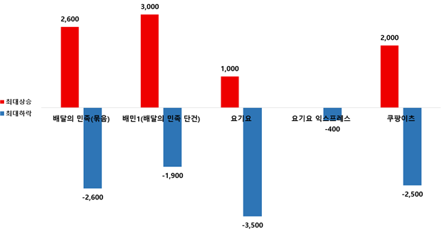 2) 최고, 최저 배달비는 3개 이상 배달비 중 top, bottom의 가격이 각 1개씩 있을 경우의 배달앱만 표시함.