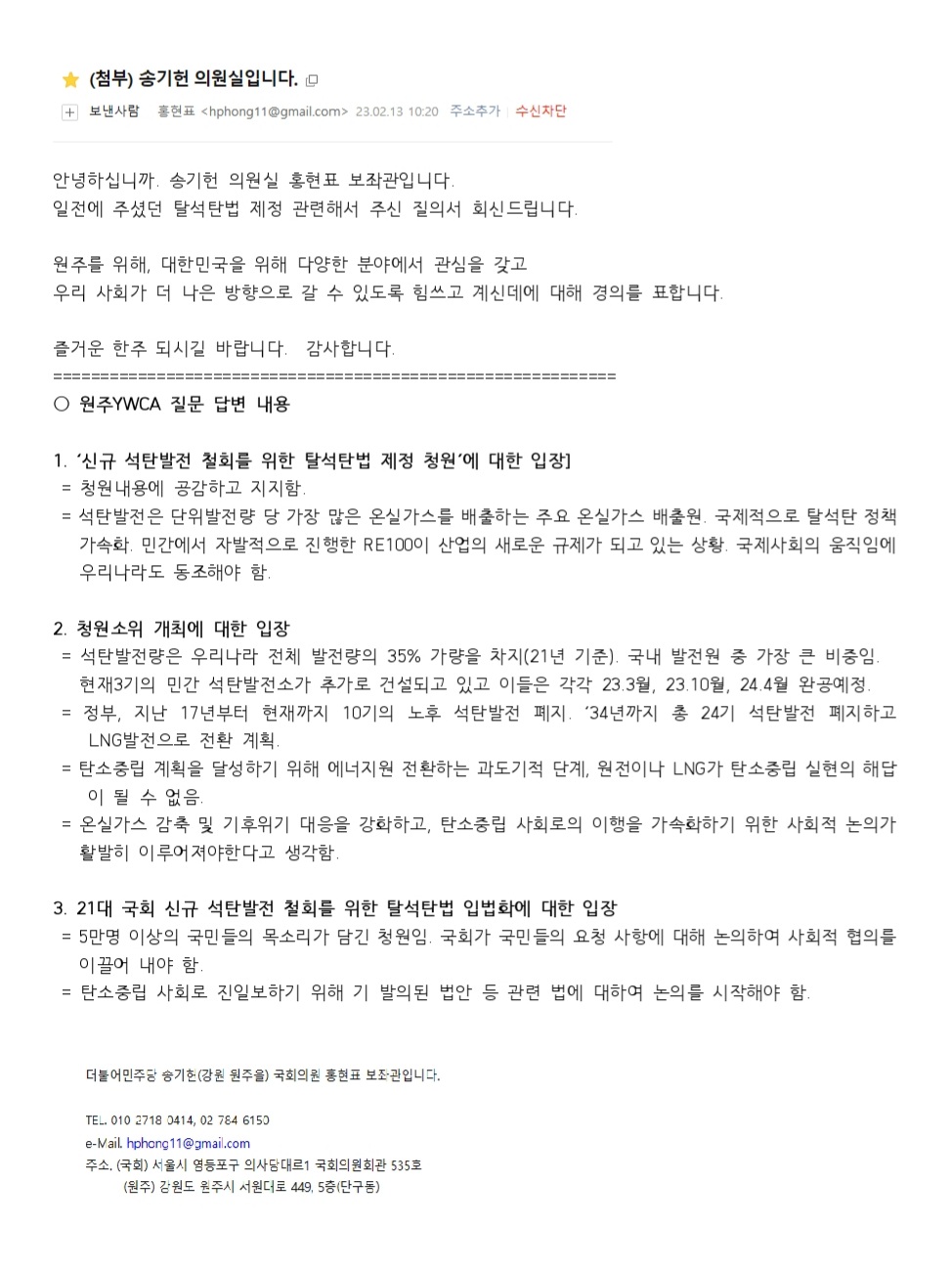 국회는 2019년 ‘기후위기 비상 대응 촉구 결의안’의 채택, 2021년 ‘탄소중립녹색성장 기본법’을 통과시킨바 있다. 만약 국회가 정말로 기후위기의 심각성을 인지하고, 그 원인인 화석연료산업을 전환할 의지가 있다면, 탈석탄을 위한 실질적 이행수단 마련은 너무나도 당연한 것이다.