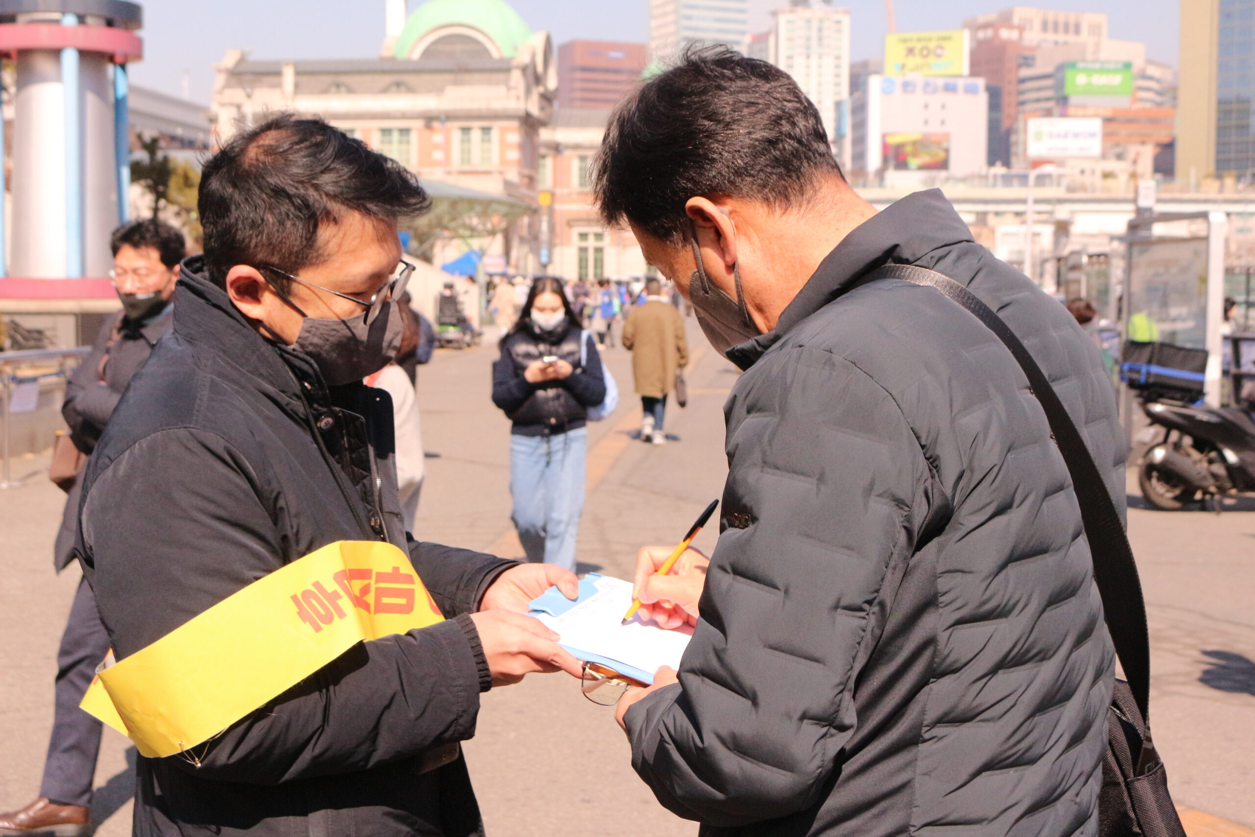 발언을 마친 후에는 핵발전소폐쇄 서명 캠페인에 참여한 전 활동가들은 서울역 광장에서 시민들에게 핵발전소의 위험성에 대해 알리며 서명 운동을 진행하였습니다.