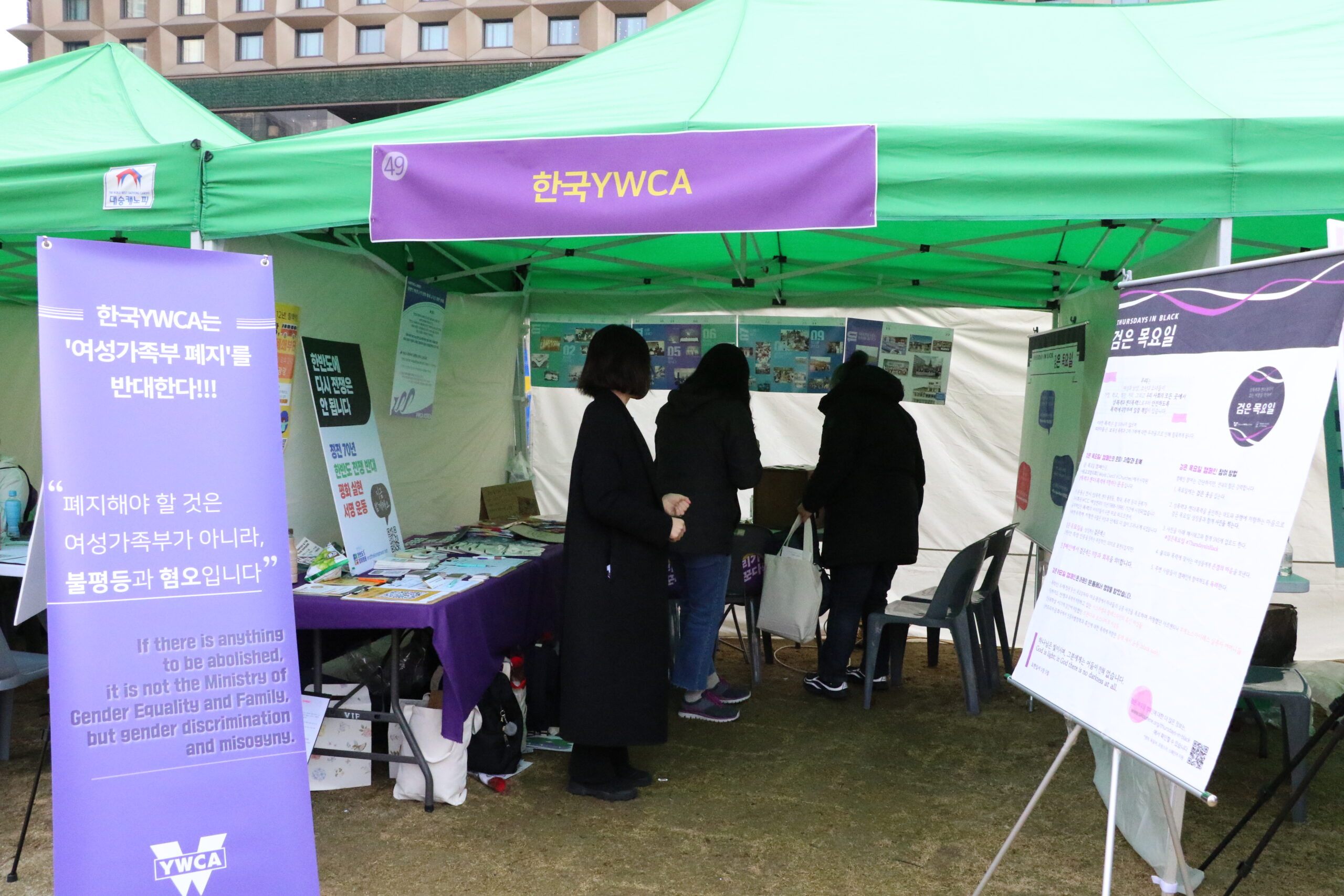 한국YWCA연합회는 부스에서 한국YWCA 여성운동 100년을 소개하고, 여성폭력 방지 캠페인인 검은 목요일(Thurdsays in Black) 캠페인을 소개하고 뱃지와 엽서를 배포했습니다. 또한 젠더관점에서 탈핵기후생명운동을 펼치고 있는 한국YWC연합회는 탈핵기후생명운동으로 핵발전소 폐쇄 서명운동에 동참을 호소하였고, 평화통일운동으로 한반도 종전평화캠페인(Korea Pesce Appeal)의 서명을 받기도 했습니다.