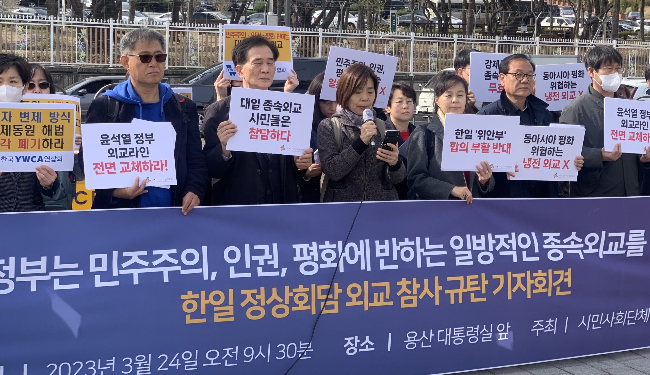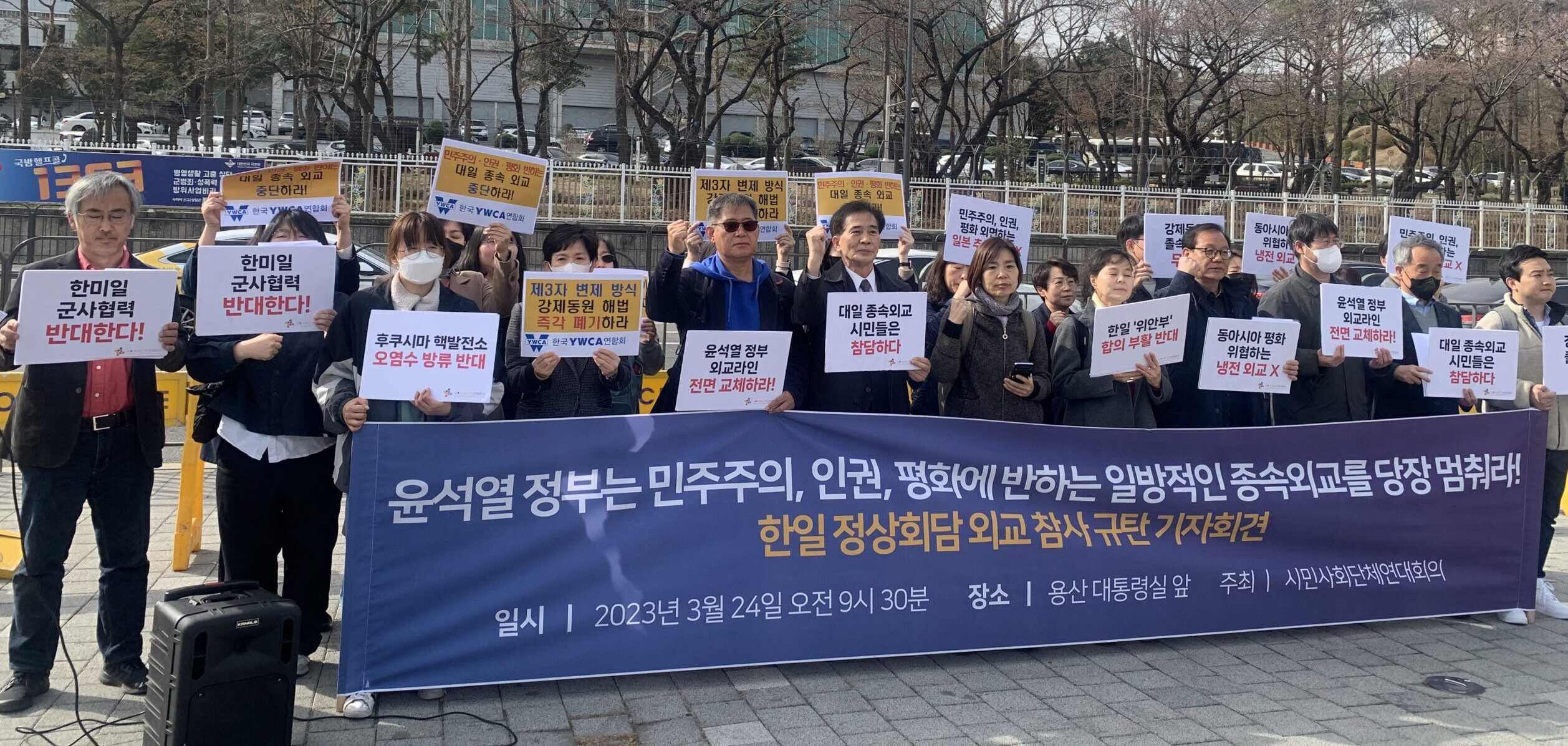 이에 시민사회단체연대회의는 3월 24일(금) 오전 9시 30분, 용산 대통령실 앞에서 한일 정상회담 외교 참사 규탄 기자회견 <윤석열 정부는 민주주의, 인권, 평화에 반하는 일방적인 종속외교를 당장 멈춰라>를 개최했다. 이날 기자회견을 통해 한일 정상회담 결과와 각종 현안에 대한 시민사회단체의 비판 입장을 밝히고, 윤석열 정부에 “▷인권규범과 법치에 반하는 강제동원 졸속해법 즉각 폐기하라 ▷한일 ‘위안부 합의’ 부활, 후쿠시마 오염수 방류에 반대한다. 정부는 명확한 입장을 밝혀라 ▷전쟁 위기 불러오는 한일, 한미일 군사협력 반대한다. 적대를 멈추고 평화를 위해 협력하라 ▷민주주의, 인권, 평화에 반하는 일방적인 대일 종속외교를 당장 멈춰라 ▷윤석열 대통령은 피해자와 국민에게 사과하고 외교 참사 책임자를 전원 교체하라”고 강력히 요구했다.