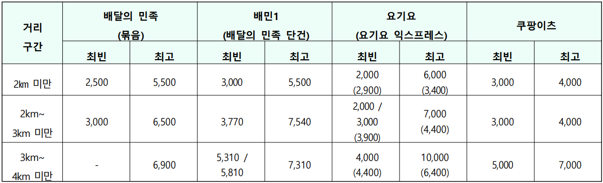 <표 1. 배달 거리에 따른 배달앱, 배달서비스에 따른 배달비 현황>