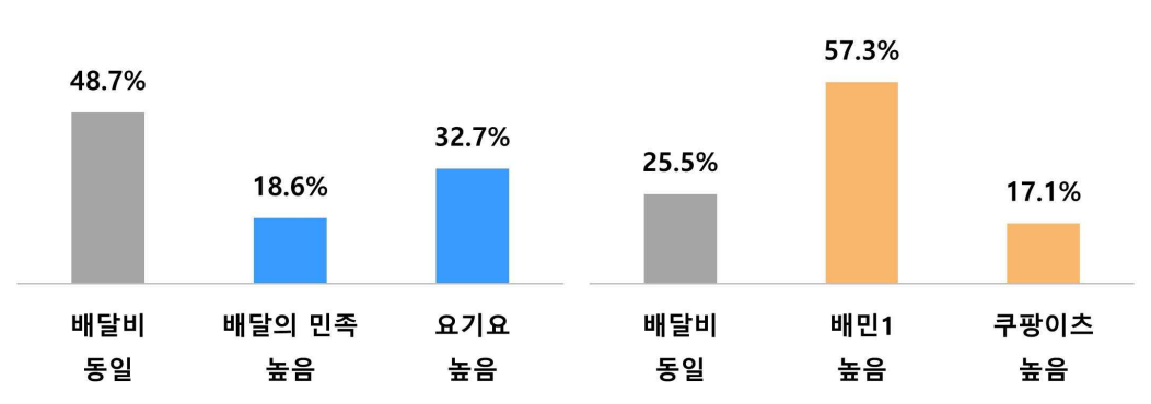 경우는 57.3%, 쿠팡이츠가 더 높은 경우는 17.1%로 나타났다.