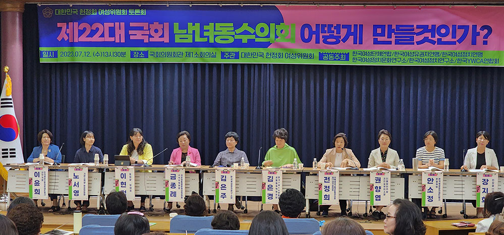토론회 ‘제22대 국회 남녀동수의회 어떻게 만들 것인가’가 7월 12일(수) 오후 1시 30분 국회의원회관 2층 제1소회의실에서 개최됐다. 2024년 4월 10일에 있을 국회의원 선거에 대비해 한국YWCA연합회를 비롯한 한국여성단체연합, 한국여성유권자연맹, 한국여성정치연맹, 한국여성정치연구소 등 5개의 여성단체가 토론회를 개최했다.