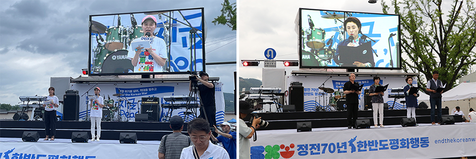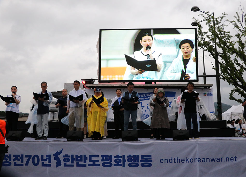 정전협정 체결 70주년을 앞두고 우리는 오늘 여기에 모였다. 전국에서, 세계 곳곳에서 이 자리에 모여 평화의 인사를 나누고 손을 맞잡았다. 우리는 이 땅 한반도와 그 주변에서 갈수록 짙어져만 가는 전쟁의 먹구름, 버섯구름의 그림자를 걷어내기 위해 행진했다. 한반도로부터 아시아와 태평양, 그리고 전 세계에 새로운 평화의 역사를 만들어 가자고 목 놓아 함께 외쳤다.