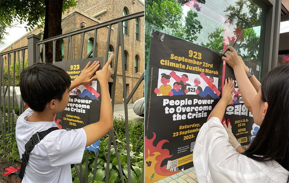▲참가자들은 오는 9월 23일(토)에 진행되는 923 기후정의행진 포스터를 붙이는 ‘포스터 액션’에도 동참했다.