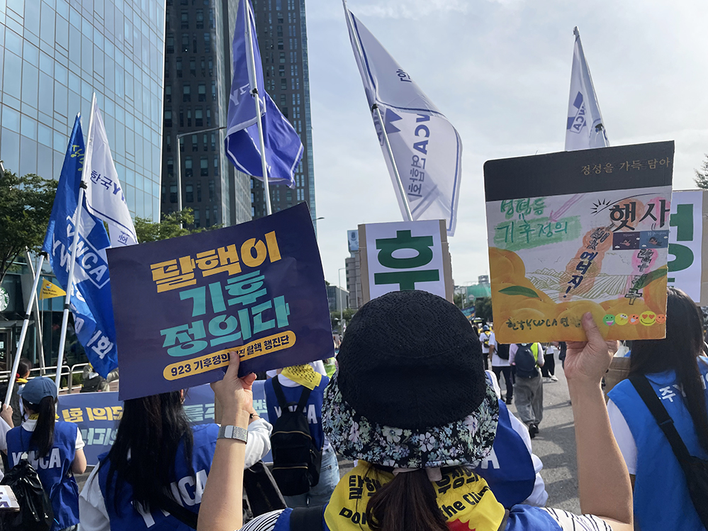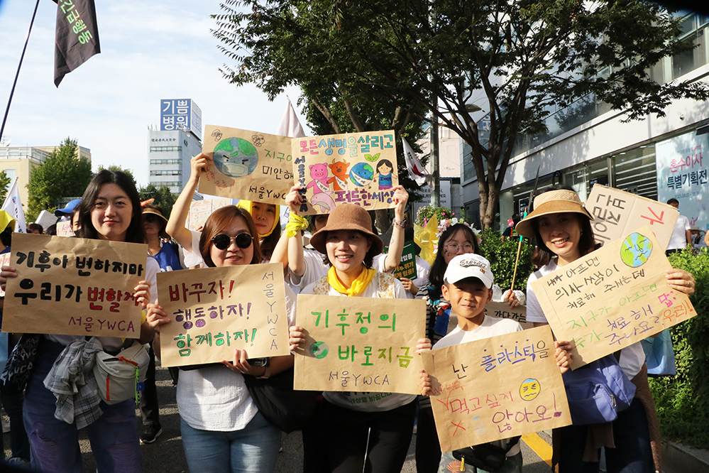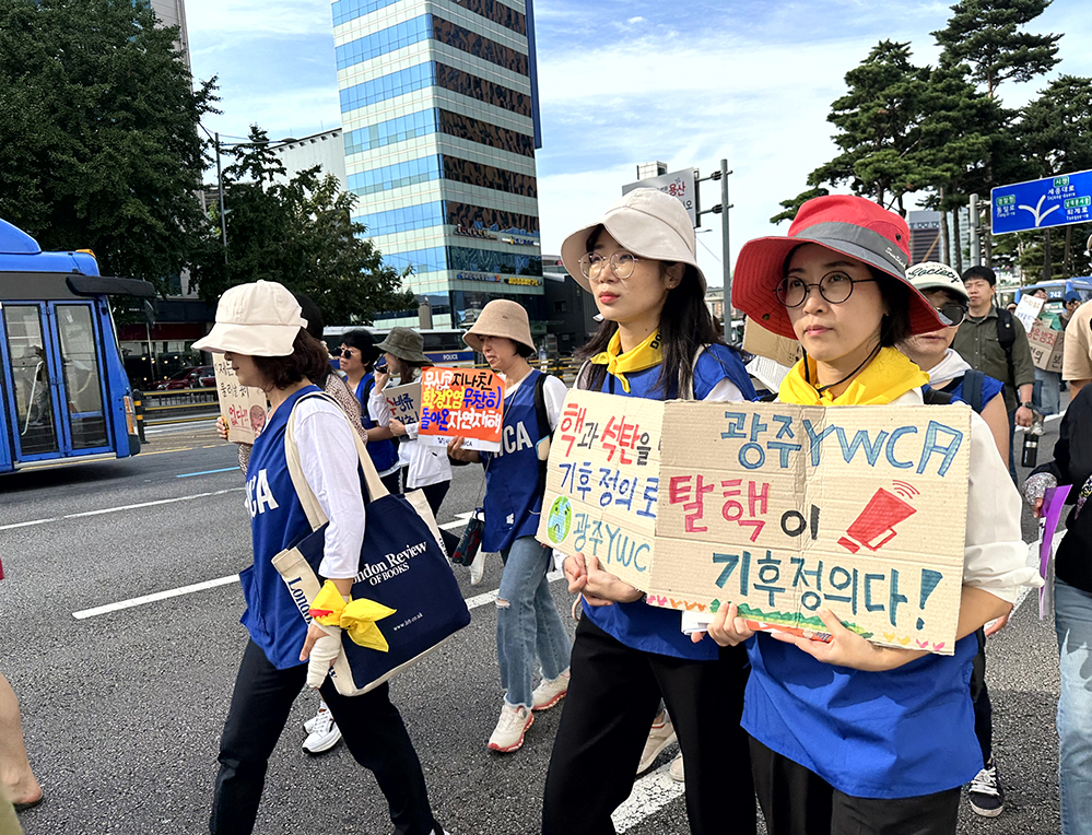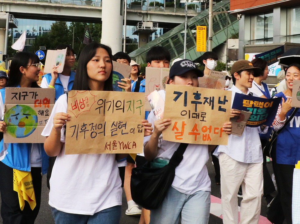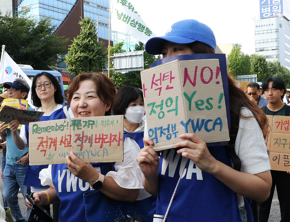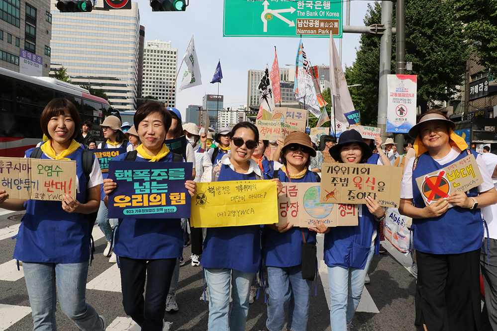 집회 후 참가자들은 서울 시청-숭례문 일대에서 출발해 서울역→남영역→용산집무실에 도착하는 1코스와 서울시청→SK본사→일본대사관→서울정부청사에 도착하는 2코스로 나뉘어 행진했다. 한국YWCA는 1코스에 참여해 “성평등 기후정의” “탈핵으로 기후정의”를 외치며 시민들의 기후정의 움직임에 동참하기를 요청했다.