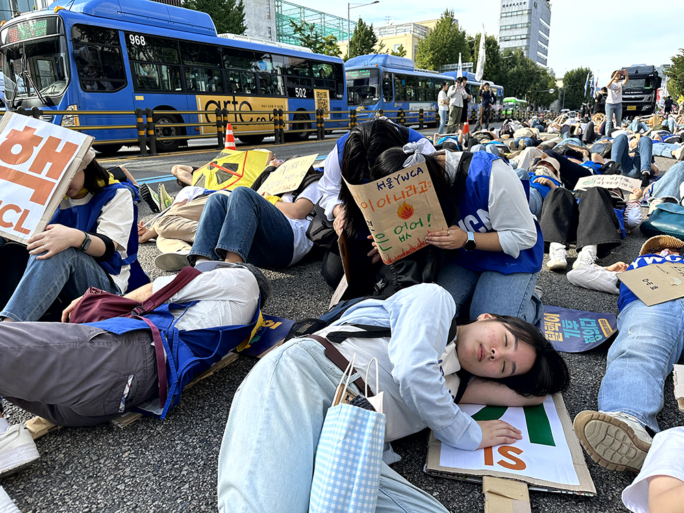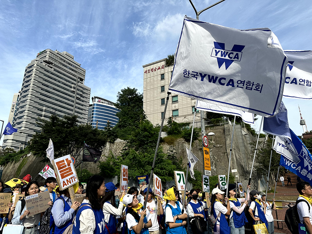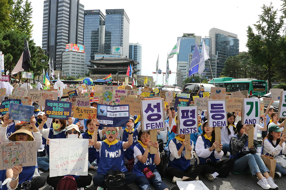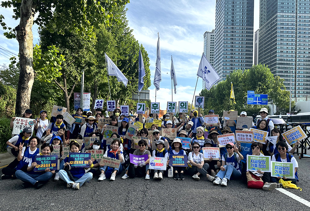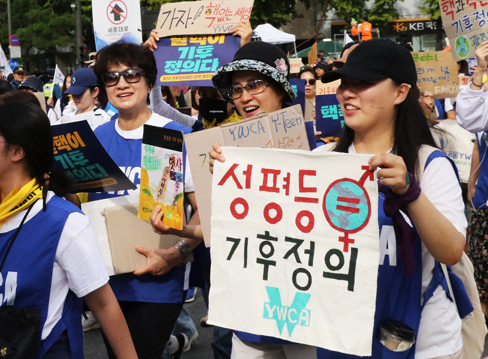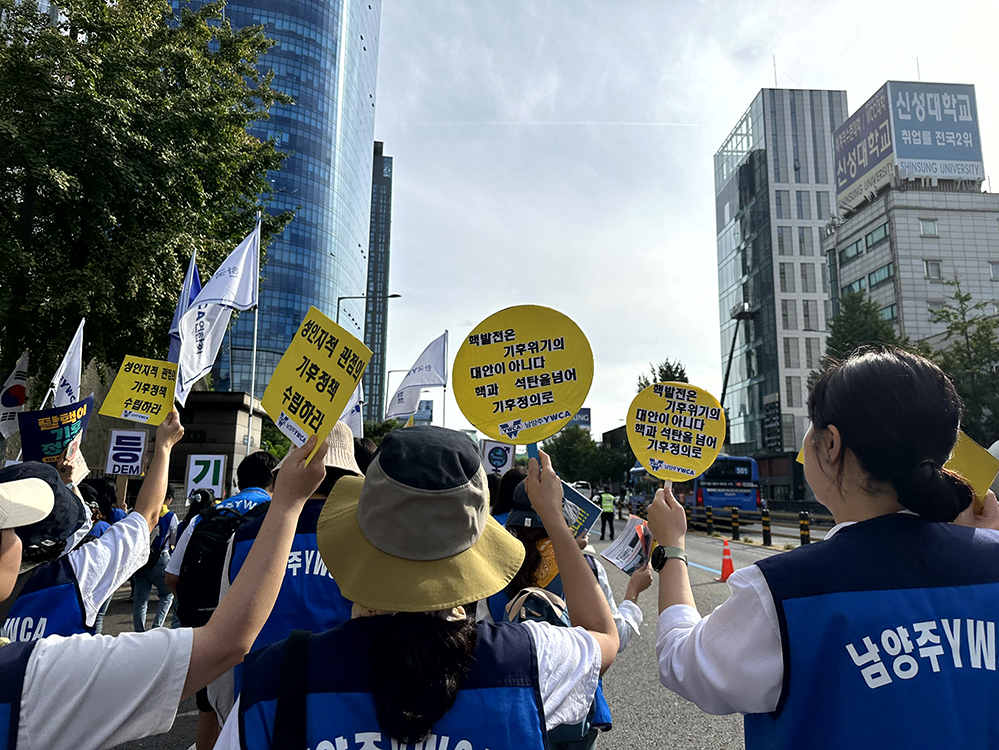 집회 후 참가자들은 서울 시청-숭례문 일대에서 출발해 서울역→남영역→용산집무실에 도착하는 1코스와 서울시청→SK본사→일본대사관→서울정부청사에 도착하는 2코스로 나뉘어 행진했다. 한국YWCA는 1코스에 참여해 “성평등 기후정의” “탈핵으로 기후정의”를 외치며 시민들의 기후정의 움직임에 동참하기를 요청했다.
